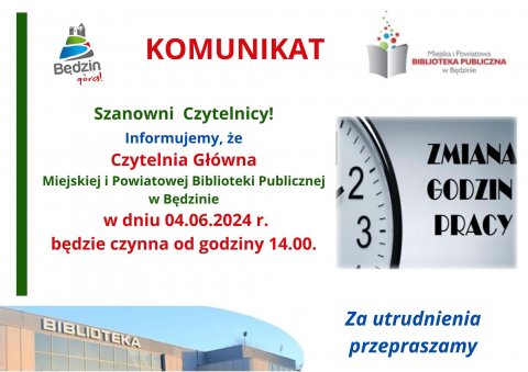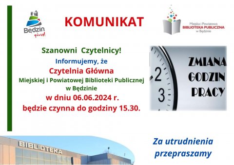 6 CZER Komunikat dot. pracy Czytelni Głównej w dniu 6 czerwca (czwartek) br. Za utrudnienia przepraszamy.