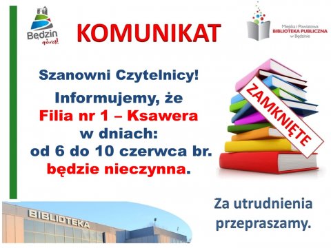 6 CZER Komunikat dot. pracy Filii nr 1 - Ksawera w terminie od 6 do 10 czerwca br. Za utrudnienia przepraszamy.