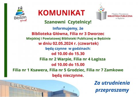 1 MAJ Komunikat dot. pracy sieci biblitoecznej w dniu 2 maja br. Za wszystkie utrudnienia przepraszamy.