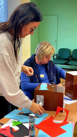 Jedną z odmian, którą warto wypróbować na sobie jest autoarteterapia. Podczas szkolenia każda z uczestniczek wykonała specjalne pudełko, w którym umieściła swoje marzenia. Na zewnątrz znalazły się obawy i lęki. To proste ćwiczenie pomaga uświadomić sobie, jak wiele wspaniałych rzeczy mamy w życiu, a jednocześnie nazwać trudności, z którymi się mierzymy. Prowadząca szkolenie, Pani Katarzyna Grysko przedstawiła ciekawe przykłady działań arteterapeutycznych od książki artystycznej i kolażowej mandali po intrygujace malowanie wirowane. Szkolenie pokazało nam arteterapii jako narzędzie, które wniesie nową, wartościową jakość do pracy z naszymi Użytkownikami – dziećmi, młodzieżą i dorosłymi.