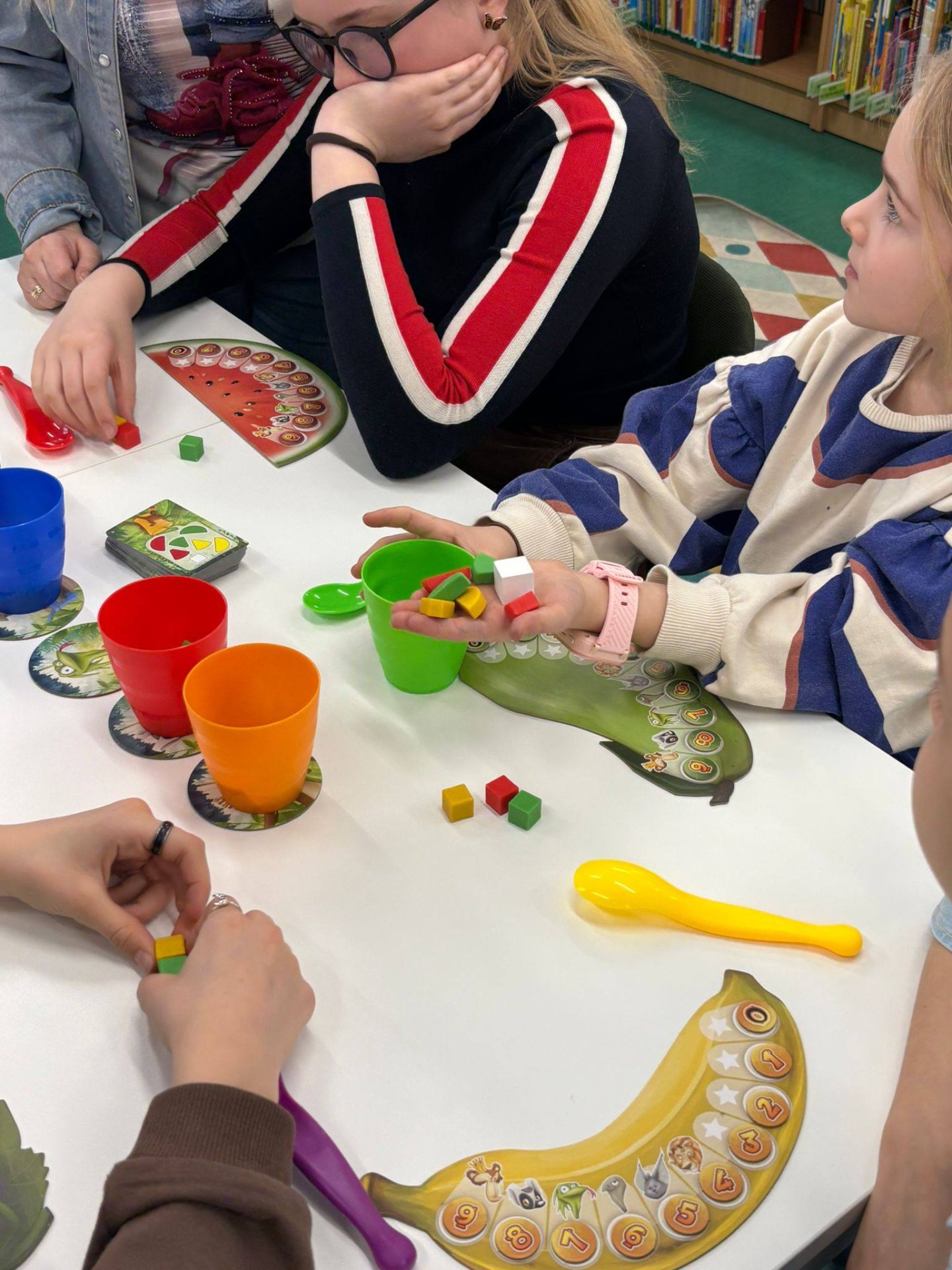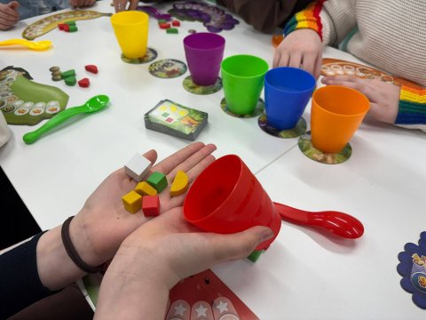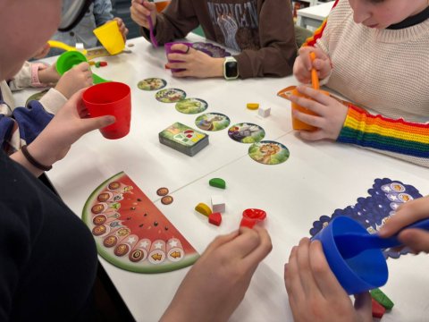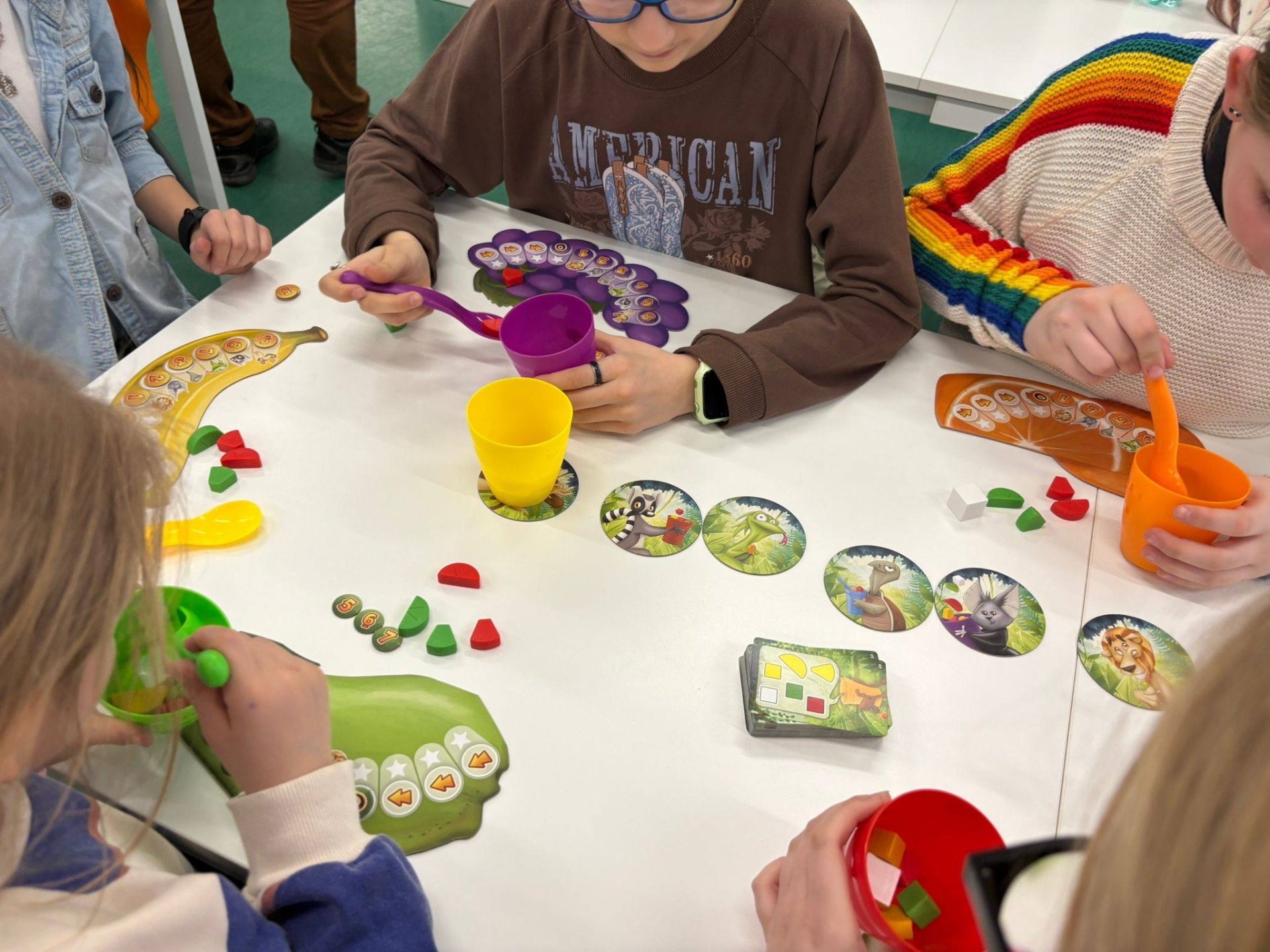 Dawno, dawno temu, podczas gier planszowych... narodziła się niezwykła gra o nazwie Fruit Cup. W tej fascynującej zabawie poznajemy mieszkańców dżungli i wspólnie tworzymy perfekcyjną sałatkę owocową dla Małpiego Króla. Zadaniem odważnych graczy jest jak najszybsze i najdokładniejsze usunięcie zbędnych elementów z kolorowego kubeczka, używając magicznej łyżeczki. Gra nie tylko oferuję mnóstwo śmiechu i emocji, ale ćwiczy logiczne myślenie. Aby rozpocząć przygodę, mali odkrywcy sięgali po specjalną kartę z zagadką, na której awersie znajdowała się łamigłówka podpowiadająca, jakie smakołyki powinny zostać w kubeczku, a które trzeba usunąć.