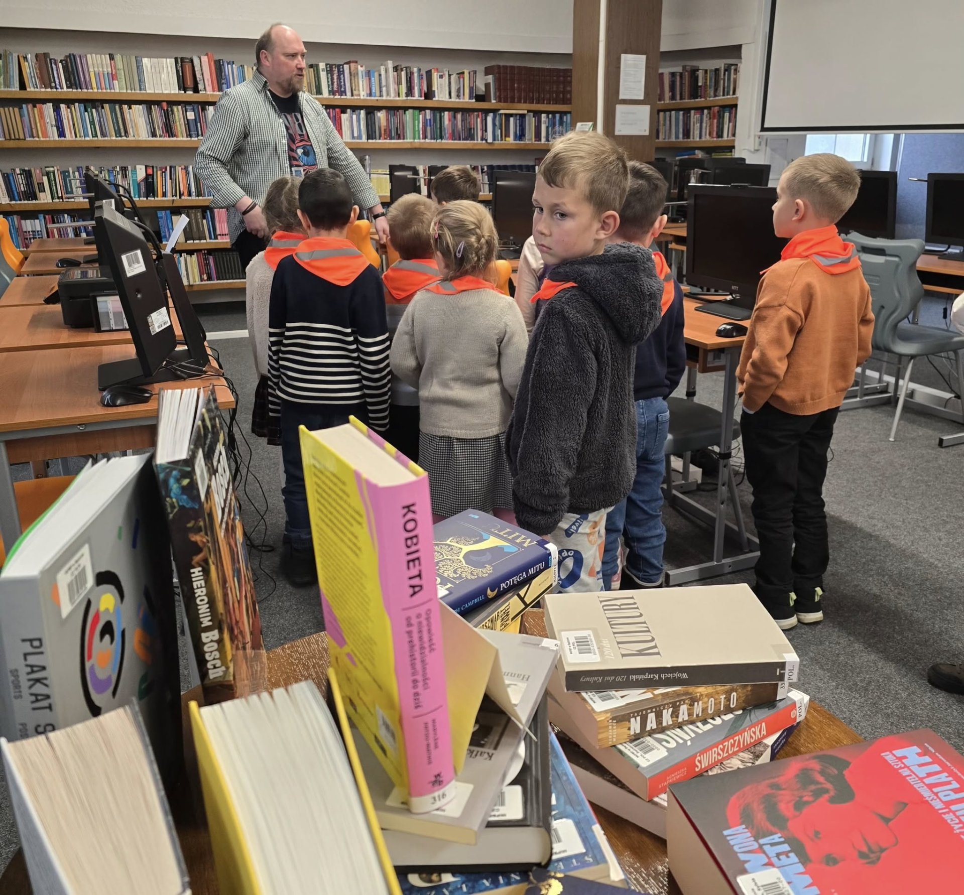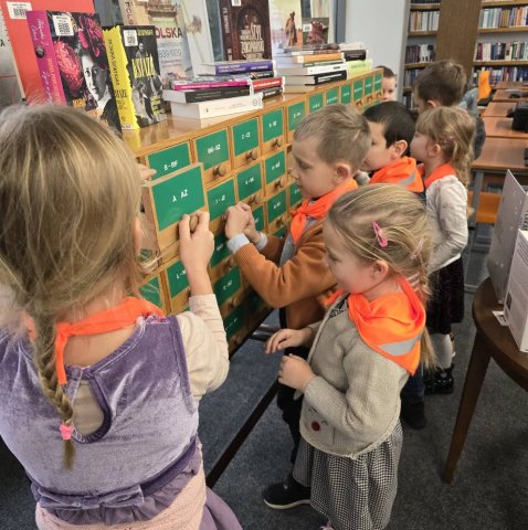 Ogromne wrażenie wywarła również wizyta w Czytelni Głównej. Dzieci z zaciekawieniem oglądały katalog kartkowy, powiększalnik tekstu z syntezatorem mowy, a także nowoczesny książkomat. Podczas zajęć rozmawialiśmy także o roli książki — o tym, że jest nie tylko źródłem wiedzy, ale również sposobem na rozwijanie wyobraźni, empatii i ciekawości świata. Książki uczą, bawią, pomagają zrozumieć innych i przenoszą nas w miejsca, do których nie zawsze możemy dotrzeć w rzeczywistości.