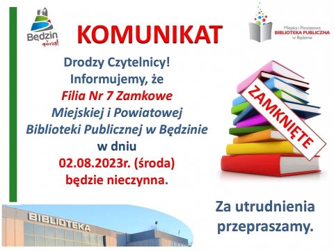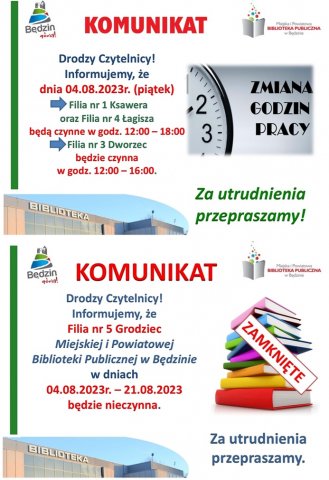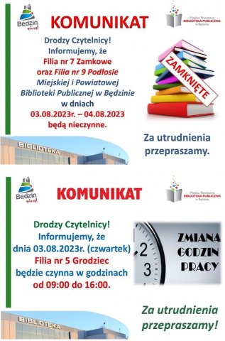 4 SIER Komunikat dot. pracy Filii nr 1 - Ksawera, nr 3 - Dworzec, nr 4 - Łagisza, oraz nr 5 - Grodziec Za utrudnienia przepraszamy.