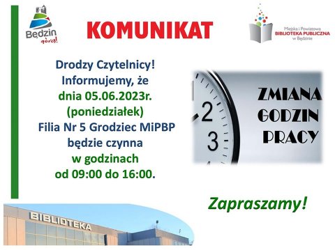 1 CZER Komunikat dot. zmiany godzin udostępniania wybranych filii w dniach 1-2 czerwca Za utrudnienia przepraszamy.