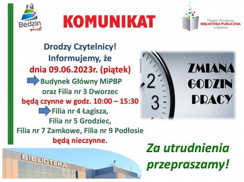9 CZER Komunikat dot. pracy Biblioteki Głównej oraz Filii MiPBP w Będzinie w dniu 9 czerwca br. Za utrudnienia przepraszamy.