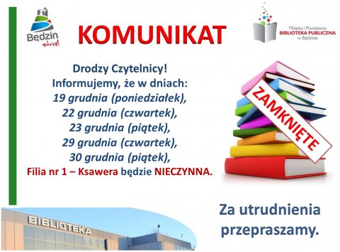 22 GRU Komunikat: dot. pracy Filii nr 1 - Ksawera i Filii nr 9 - Podłosie w dniach 22 i 23 grudnia br. Przepraszamy za utrudnienia.