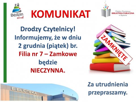 2 GRU Komunikat: Filia nr 7 - Zamkowe w dniu 2 grudnia (piątek) br. będzie nieczynna. Przepraszamy za utrudnienia.