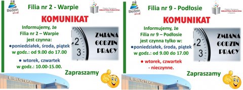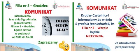 1 GRU Zmiana godzin otwarcia Filii nr 2 - Warpie oraz Filii nr 9 - Podłosie w grudniu br. Przepraszamy za utrudnienia.
