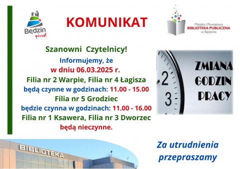 6 MAR Komunikat dot. pracy Filii MiPBP w Będzinie w dniu 6 marca 2025 r. Za utrudnienia przepraszamy.