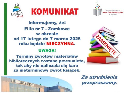 18 LUT Komunikat dot. pracy Filii nr 7 - Zamkowe Za wszelkie utrudnienia przepraszamy i zapraszamy do korzystania ze zbiorów Biblioteki Głównej.