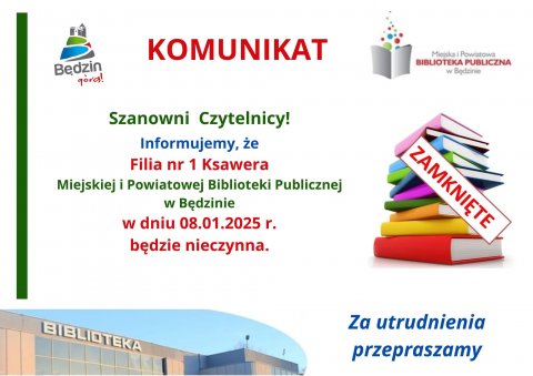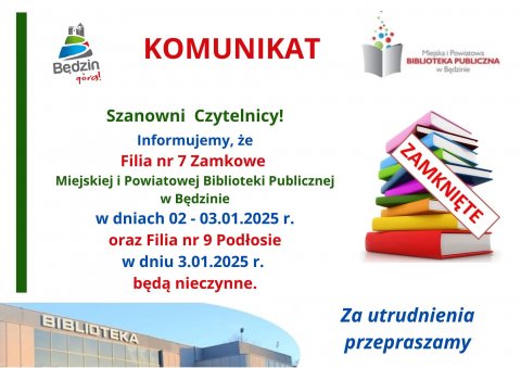 2 STY Komunikat dot. pracy Filii nr 7 - Zamkowe oraz Filii nr 9 - Podłosie Za utrudnienia przepraszamy.