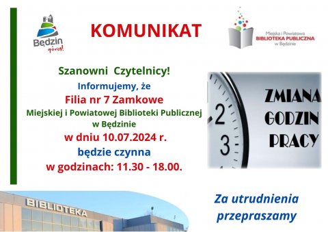 5 LIP Komunikat dot. pracy Filii nr 1 - Ksawera oraz Filii nr 4 - Łagisza Za utrudnienia przepraszamy.