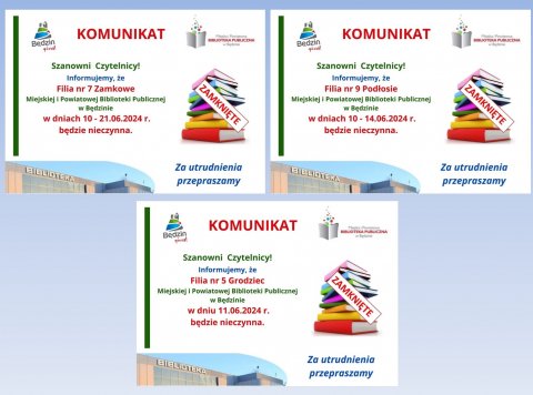 7 CZER Komunikat dot. zamknięcia filii MiPBP w Będzinie w dniu 10 czerwca oraz w dniach kolejnych. Za utrudnienia przepraszamy.