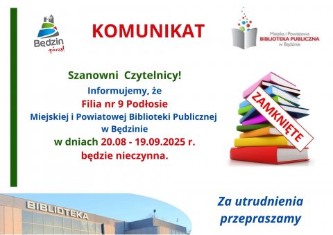 20 SIER Komunikat dot. pracy Filii nr 9 - Podłosie od 20 sierpnia do 19 września br. Za utrudnienia przepraszamy.
