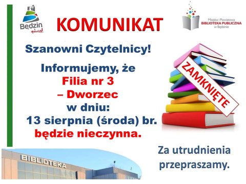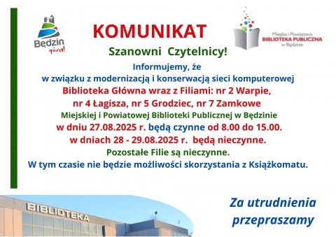 21 SIER Komunikat dot. pracy Biblioteki Głównej oraz Filii w dniach 27 - 29 sierpnia br. Za utrudnienia przepraszamy, licząc na wyrozumiałość naszych Czytelników.