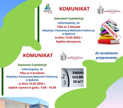 13 LUT Komunikat dot. pracy Filii nr 2 - Warpie oraz Filii nr 5 - Grodziec Za utrudnienia przepraszamy.