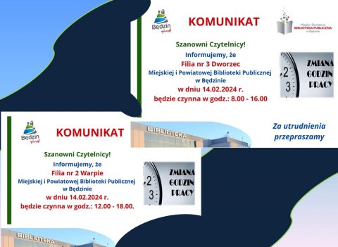 14 LUT Komunikat dot. pracy Filii nr 2 - Warpie oraz Filii nr 3 - Dworzec Za utrudnienia przepraszamy.