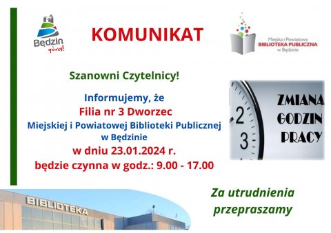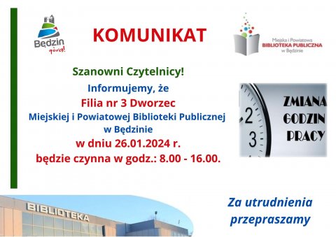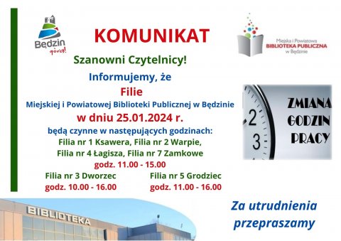 24 STY Komunikat dot. pracy filii bibliotecznych MiPBP w Będzinie w dniu 25 stycznia br. Za utrudnienia przepraszamy.