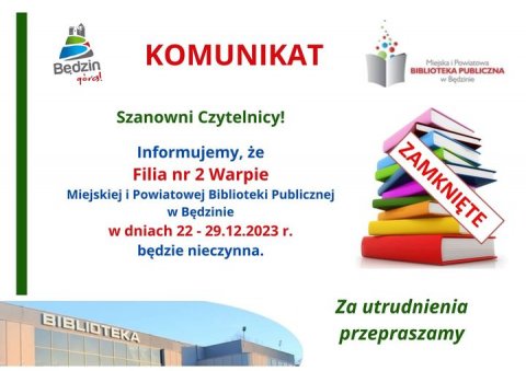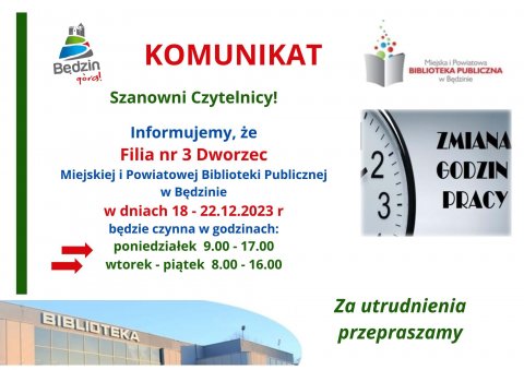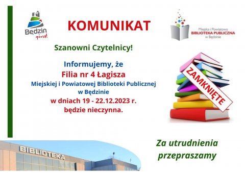 19 GRU Komunikat dot. pracy Filii nr 4 - Łagisza Filia nr 4 - Łagisza w dniach od 19 do 22 grudnia br. będzie zamknięta.