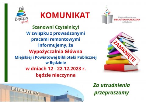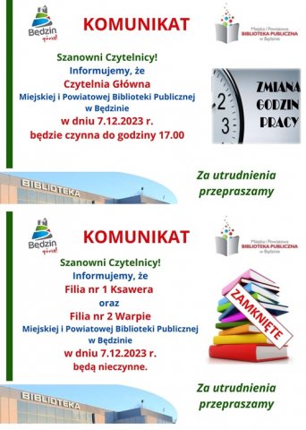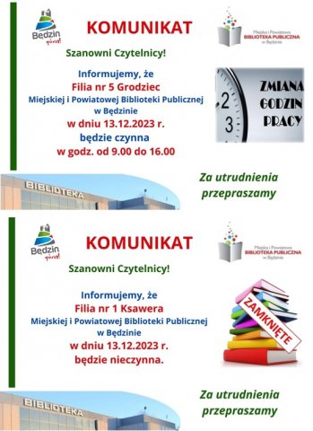 13 GRU Komunikat dot. pracy Filii nr 1 - Ksawera oraz oraz Filii nr 5 - Grodziec Za utrudnienia przepraszamy.
