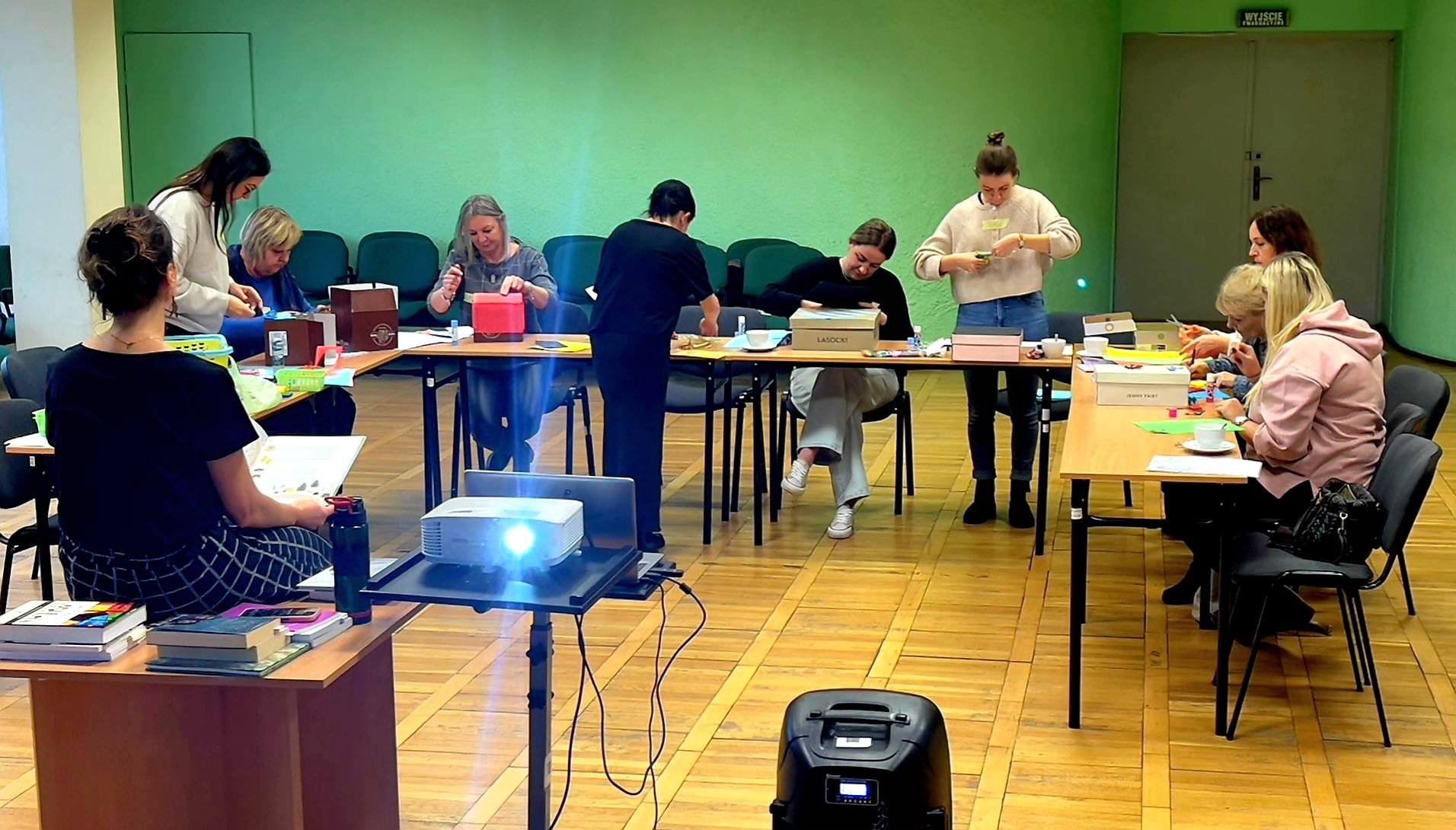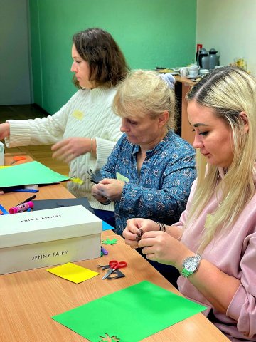 Jedną z odmian, którą warto wypróbować na sobie jest autoarteterapia. Podczas szkolenia każda z uczestniczek wykonała specjalne pudełko, w którym umieściła swoje marzenia. Na zewnątrz znalazły się obawy i lęki. To proste ćwiczenie pomaga uświadomić sobie, jak wiele wspaniałych rzeczy mamy w życiu, a jednocześnie nazwać trudności, z którymi się mierzymy. Prowadząca szkolenie, Pani Katarzyna Grysko przedstawiła ciekawe przykłady działań arteterapeutycznych od książki artystycznej i kolażowej mandali po intrygujace malowanie wirowane. Szkolenie pokazało nam arteterapii jako narzędzie, które wniesie nową, wartościową jakość do pracy z naszymi Użytkownikami – dziećmi, młodzieżą i dorosłymi.