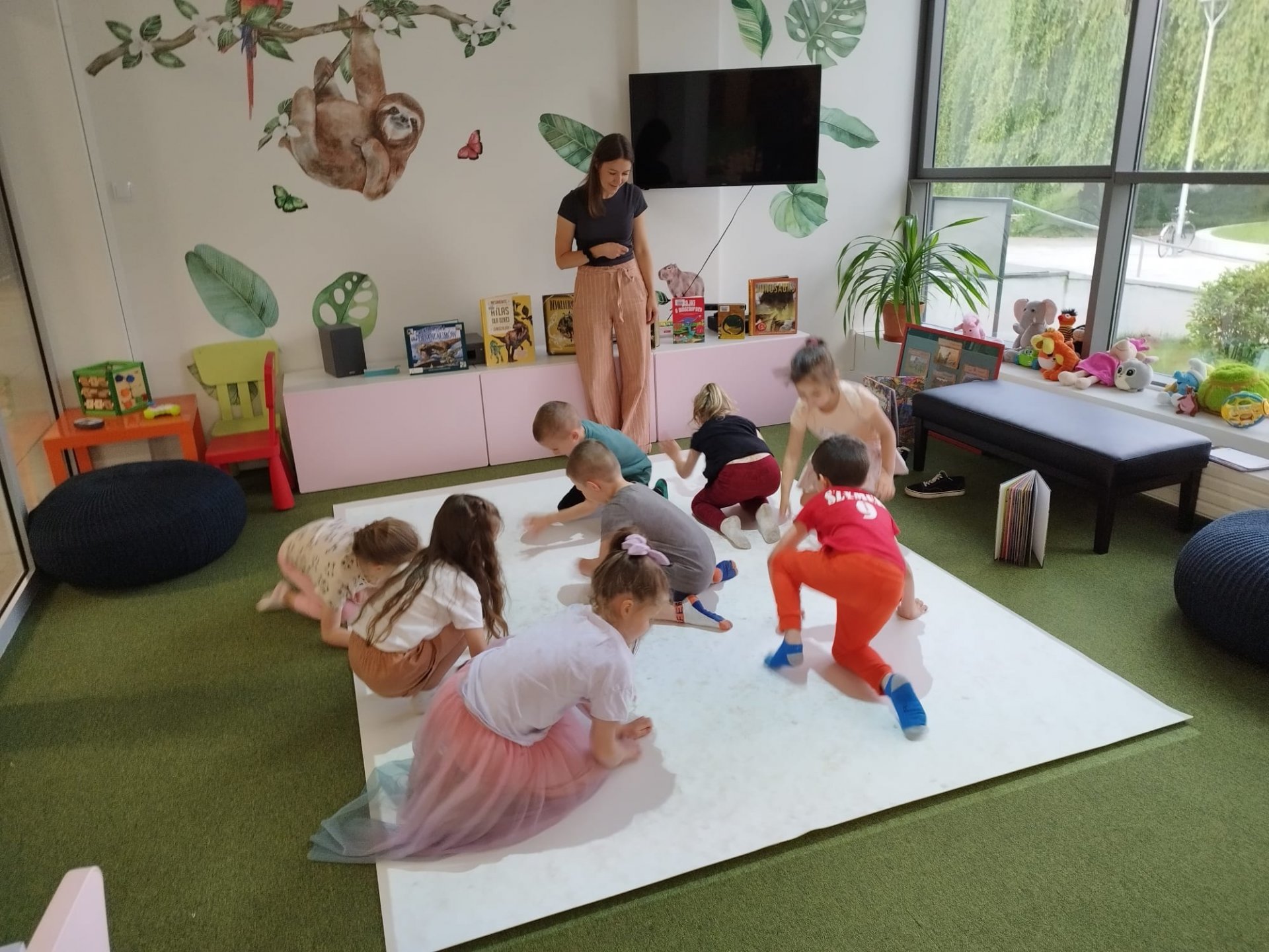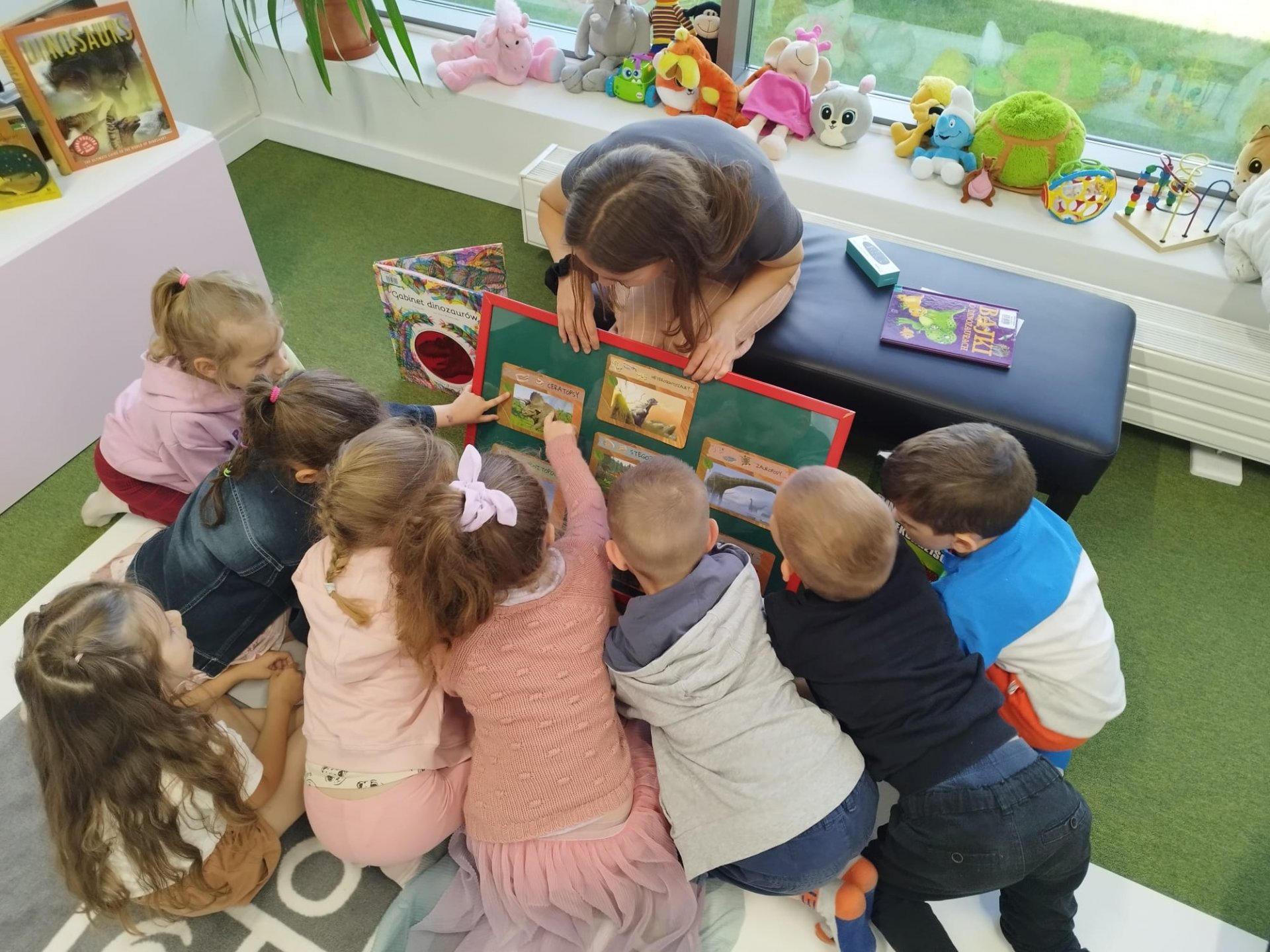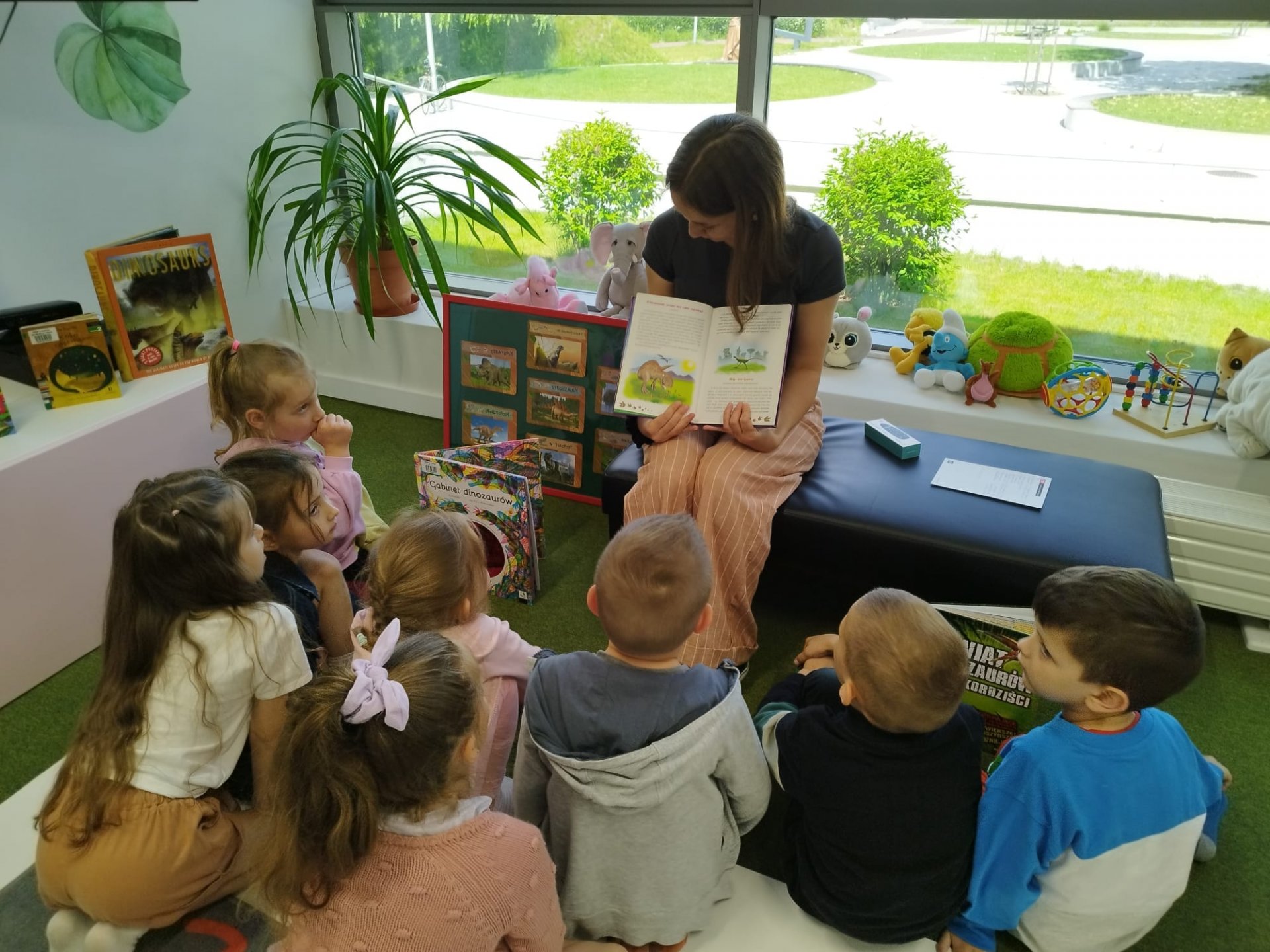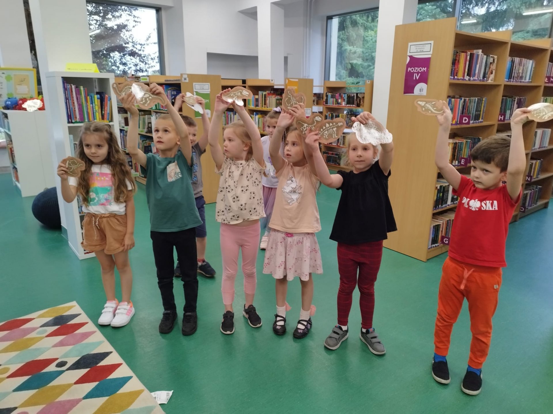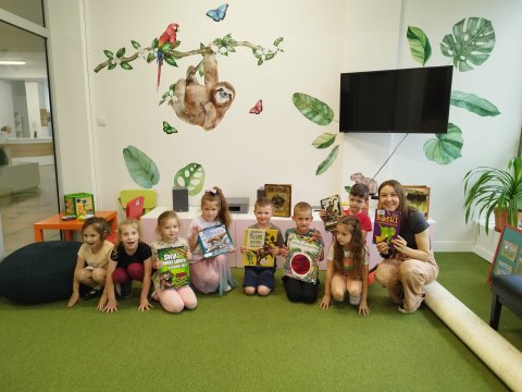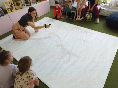 Dzieci są pełne ciekawości, uwielbiają odkrywać, a odwiedzenie biblioteki to danie im możliwości rozwoju zainteresowań. Z takim postanowieniem wybrały się z wizytą do oddziału dla dzieci i młodzieży dzieci z Przedszkola Miejskiego nr 13 w Będzinie. Głodni wiedzy uczestnicy zajęć mieli okazję wysłuchać historii z czasów, kiedy ludzi jeszcze nie było na świecie. Giganci tamtych czasów - dinozaur. To szeroki temat, który pozwala rozwijać w dzieciach wyobrażnię oraz zainteresowanie naukami ścisłymi. Dzięki interaktywnej podłodze znajdującej się w przestrzeni multimedialnej oddzialu dla dzieci i młodzieży uczestnicy spotkania wcielili się w prawdziwych paleontologów. Zabawa w odkopywanie skamieniałości wciągnęła dzieci tak, że ich apetyt na wiedzę wzrósł kilkukrotnie. Wysłuchały więc "Bajek o dinozaurach" Elżbiety Safarzyńskiej, które oprócz wesołych przygód zawierają także mnóstwo ciekawostek oraz książki "Gabinet dinozaurów" stworzonej przez Lucy Brownridge oraz Carnovsky'ego. Wydawnictwo zawiera wyjątkowe ilustracje, które można podziwiać dzięki okularom o trzech różnych szkiełkach.