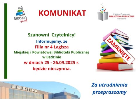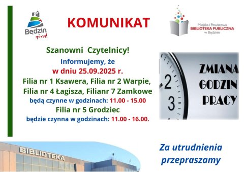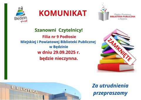 24 WRZ Komunikat dot. pracy filii bibliotecznych MiPBP w Będzinie w dniu 24 września br. Za utrudnienia przepraszamy.