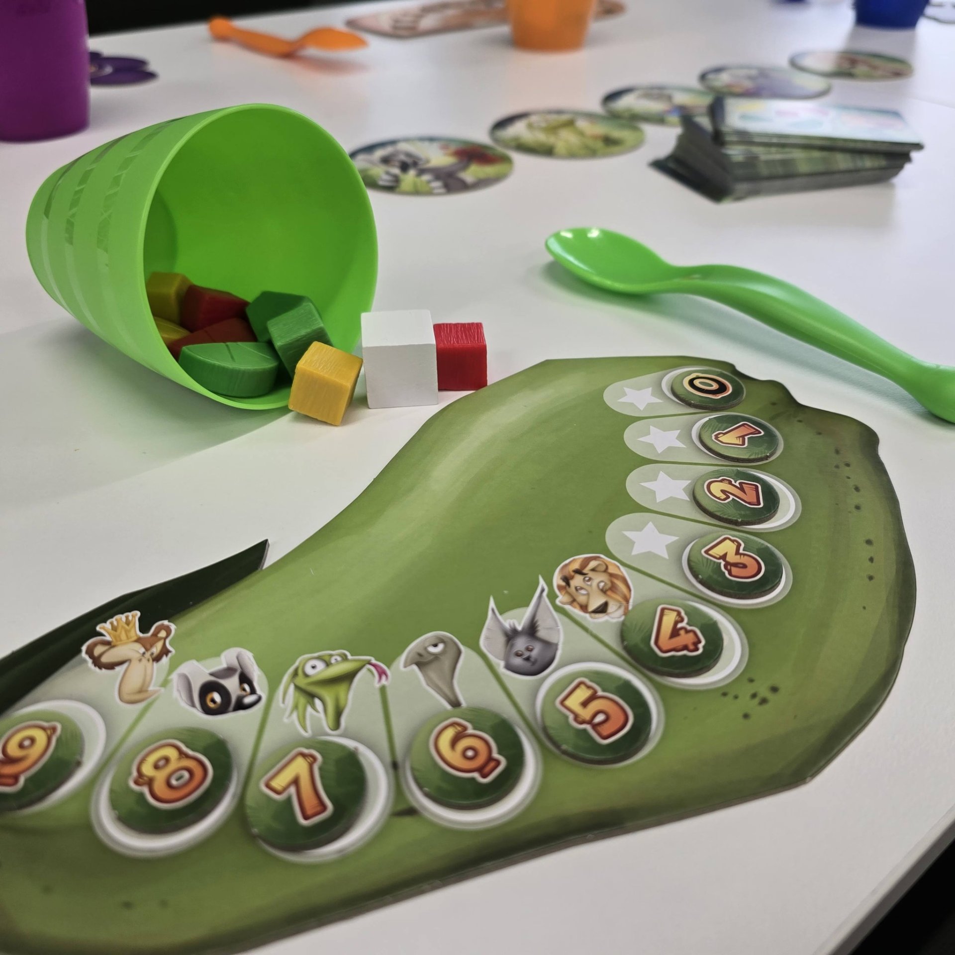 Dawno, dawno temu, podczas gier planszowych... narodziła się niezwykła gra o nazwie Fruit Cup. W tej fascynującej zabawie poznajemy mieszkańców dżungli i wspólnie tworzymy perfekcyjną sałatkę owocową dla Małpiego Króla. Zadaniem odważnych graczy jest jak najszybsze i najdokładniejsze usunięcie zbędnych elementów z kolorowego kubeczka, używając magicznej łyżeczki. Gra nie tylko oferuję mnóstwo śmiechu i emocji, ale ćwiczy logiczne myślenie. Aby rozpocząć przygodę, mali odkrywcy sięgali po specjalną kartę z zagadką, na której awersie znajdowała się łamigłówka podpowiadająca, jakie smakołyki powinny zostać w kubeczku, a które trzeba usunąć.