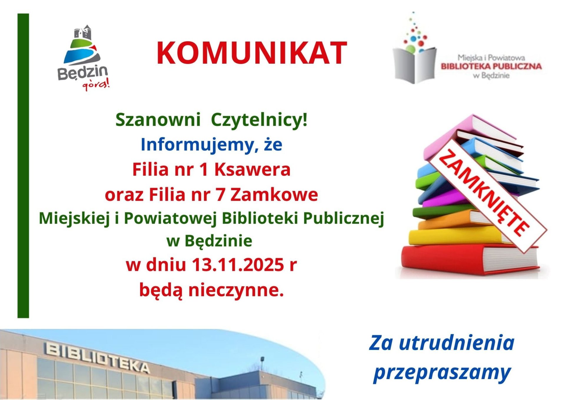 Szanowni Czytelnicy informujemy, że Filia nr 1 Ksawera oraz Filia nr 7 Zamkowe 13.11.2025 r. (czwartek) będą nieczynneZa utrudnienia przepraszamy.