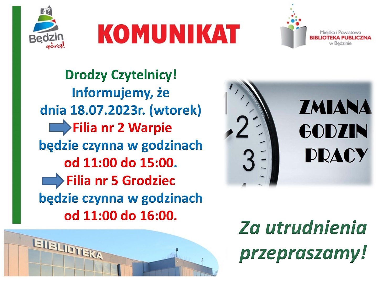 Szanowni Użytkownicy, informujemy o zmianie godziny otwarcia Filii nr 2 - Warpie oraz Filii nr 5 - Grodziec w dniu 18 lipca (wtorek) 2023 r. Za utrudnienia przepraszamy.