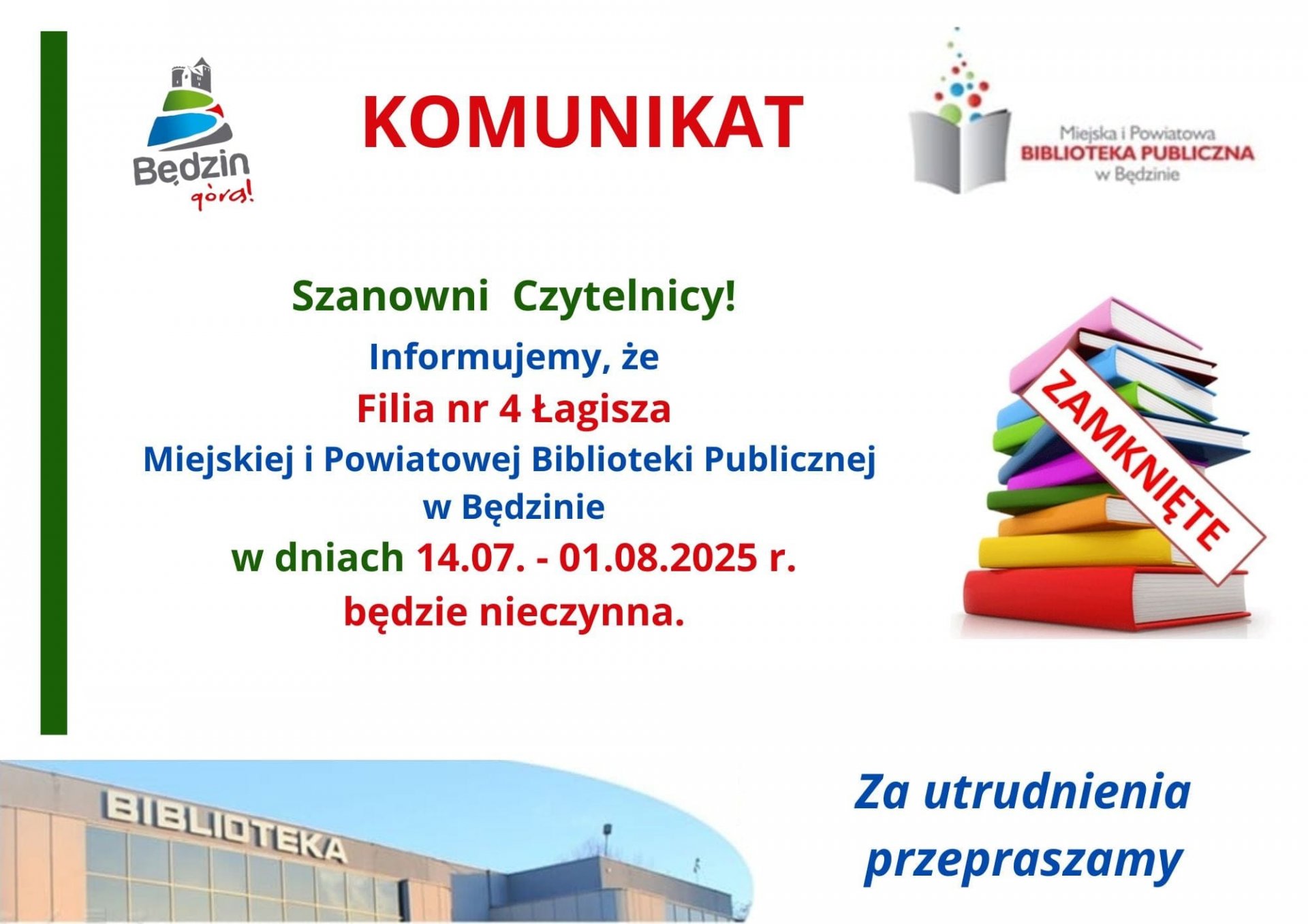 informujemy, że Filia nr 4 Łagisza w okresie 14.07.2025 r. - 01.08.2025 r. będzie nieczynna.