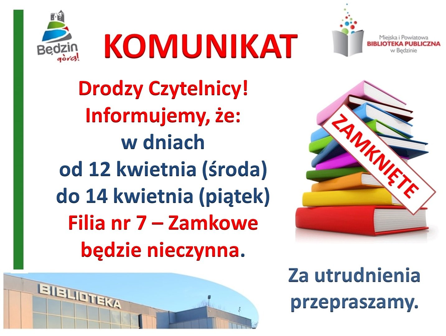 Komunikat dot. zamknięcia Filii nr 7 - Zamkowe w dniach od 12 do 14 kwietnia 2023 r.