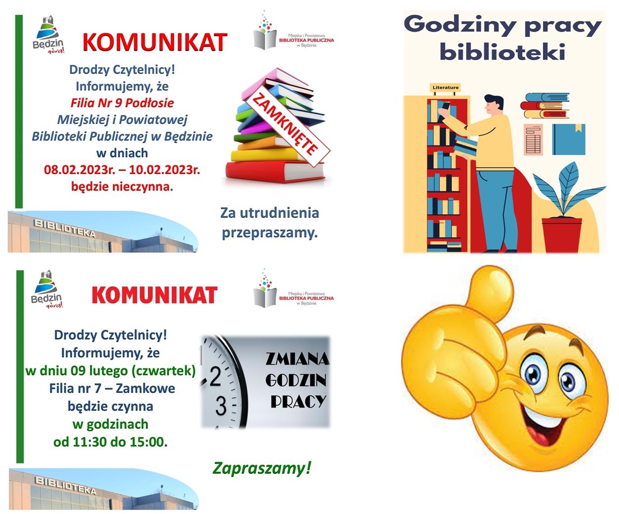 Ponadto informujemy, że Filia Nr 7 Zamkowe Miejskiej i Powiatowej Biblioteki Publicznej w Będzinie w dniu 09.02.2023r. (czwartek) będzie czynna w godz. 11:30 - 15:00.