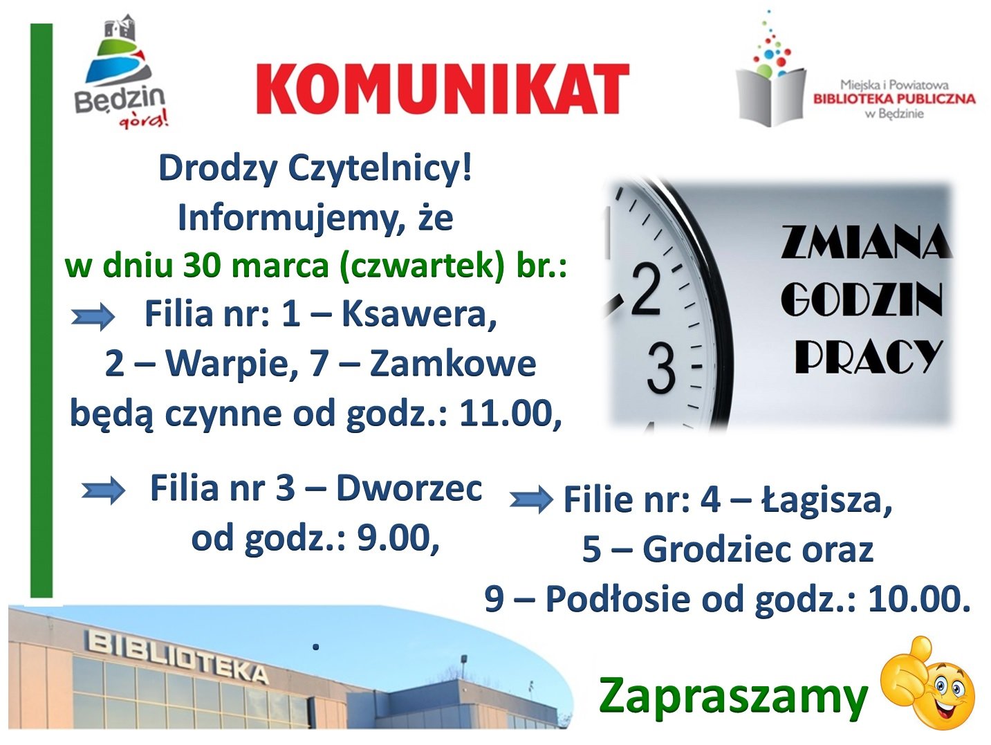 Szanowni Czytelnicy, Informujemy, że w dniu 30 marca br. (czwartek) → Filie nr: 1 - Ksawera, 2 - Warpie oraz 7 - Zamkowe będą czynne od godz.: 11.00 → Filia nr: 3 - Dworzec będzie czynna od godz.: 9.00 → Filie nr: 4 - Łagisza, 5 - Zamkowe oraz 9 - Podłosie będą czynne od godz.: 10.00. Zapraszamy