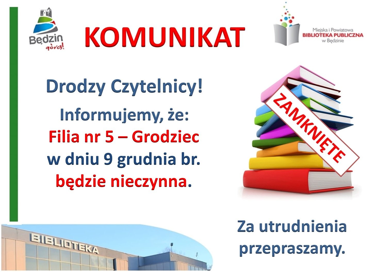 Komunikat: Filia nr 5 - Grodziec w dniu 9 grudnia (piątek) br. będzie nieczynna.