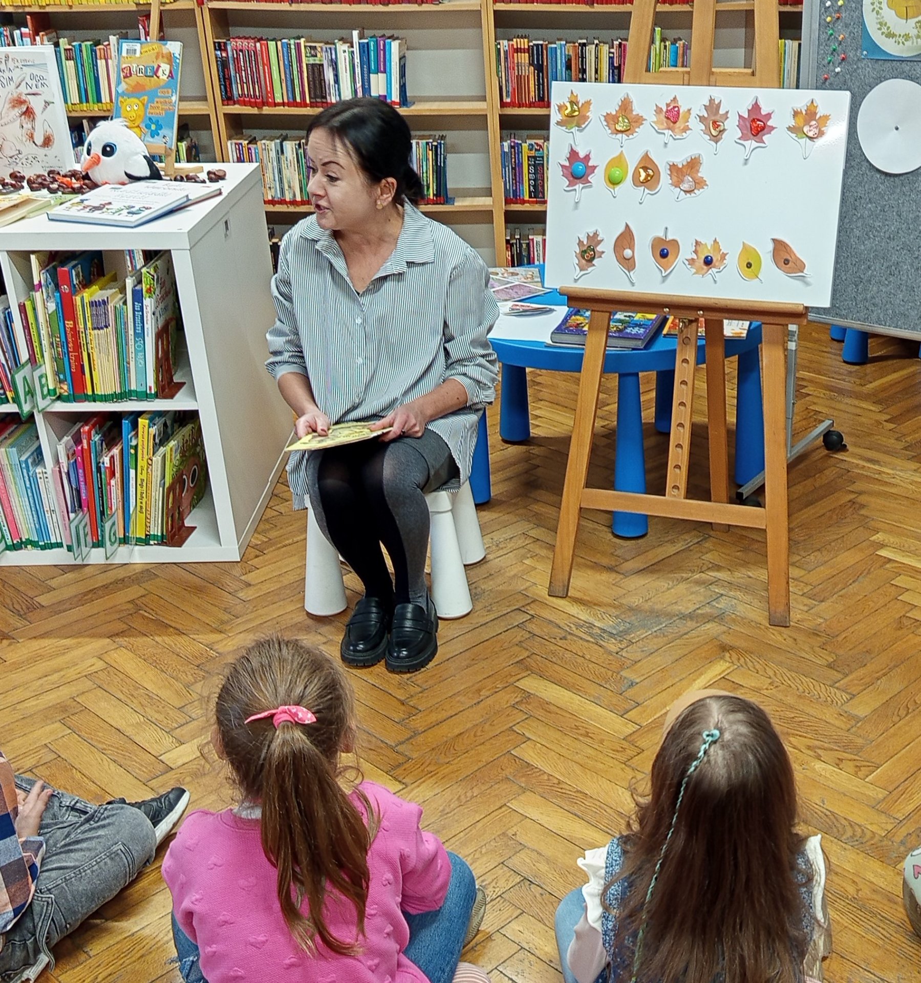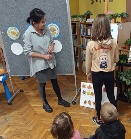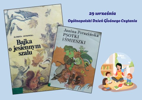 29 września obchodziliśmy Ogólnopolski Dzień Głośnego Czytania. Z tej okazji grupa Motylków z Przedszkola Miejskiego nr 6 w Będzinie odwiedziła Filię nr 1 - Ksawera. Ponieważ data święta związana jest z dniem urodzin wspaniałej polskiej autorki książek dla dzieci Janiny Porazińskiej, spotkanie rozpoczęliśmy właśnie od jej utworu. Z książki pt. "Psotki i śmieszki" wybraliśmy wiersz "Na grzyby!", który pięknie opisuje jesienne przysmaki. Pozostając w klimacie rozpoczętej niedawno pory roku przedstawiony został rymowany tekst "Bajki o jesiennym szalu" autorstwa Elżbiety Ostrowskiej. Książka jest bardzo ciekawie skonstruowana, bowiem mali słuchacze ćwiczą w jej trakcie umiejętność liczenia.