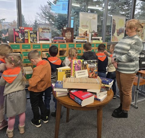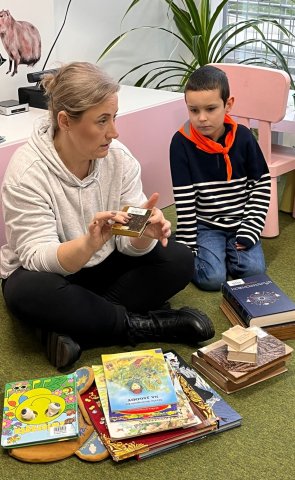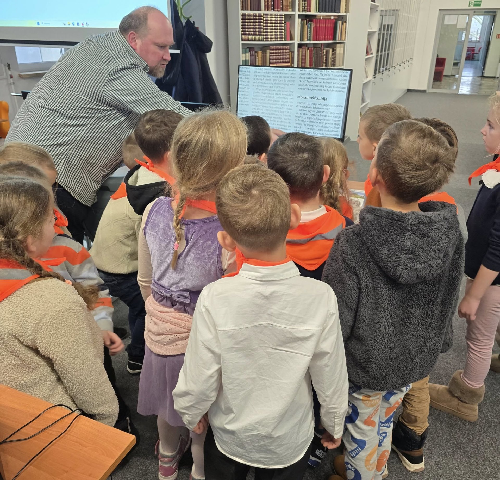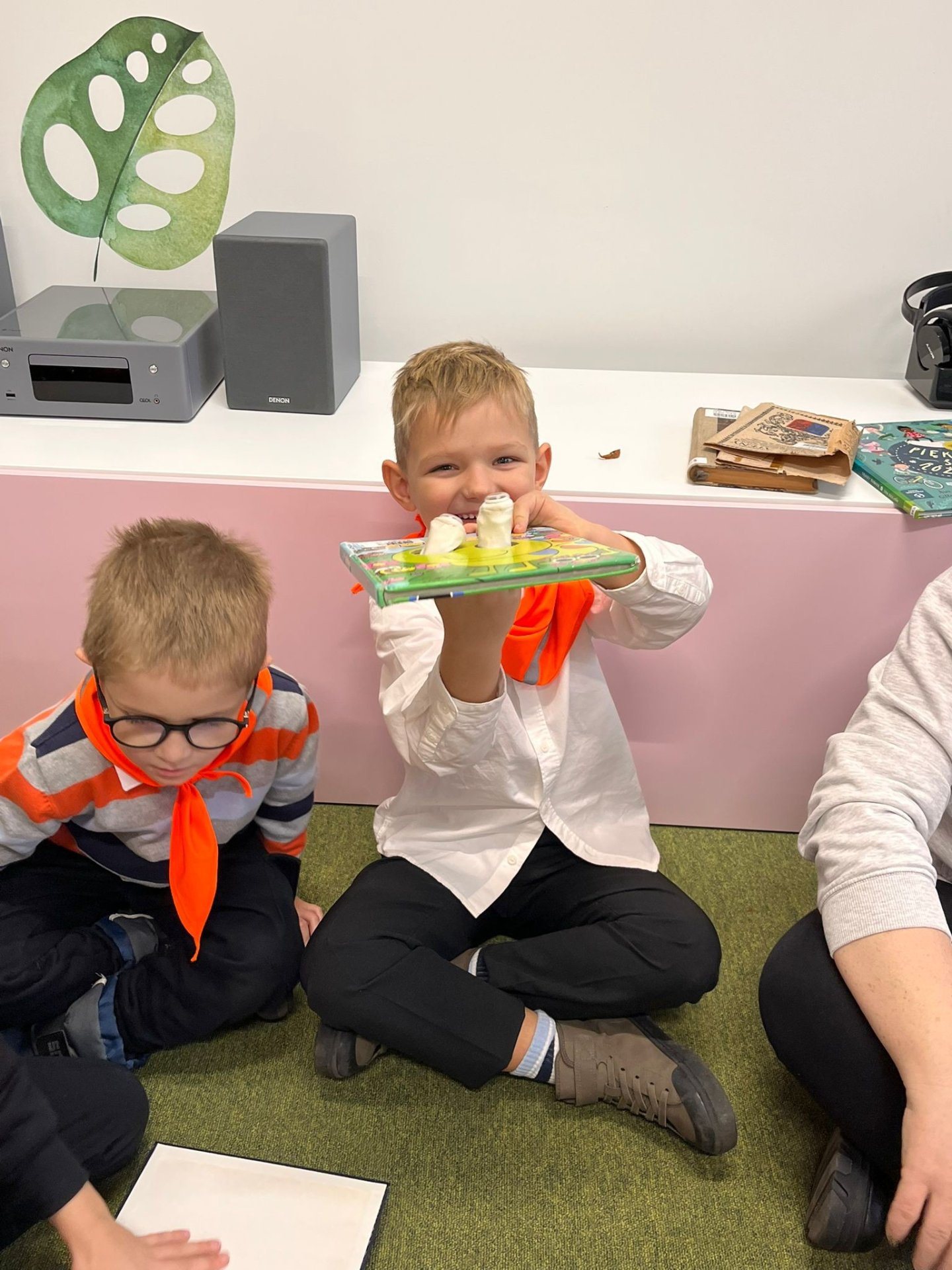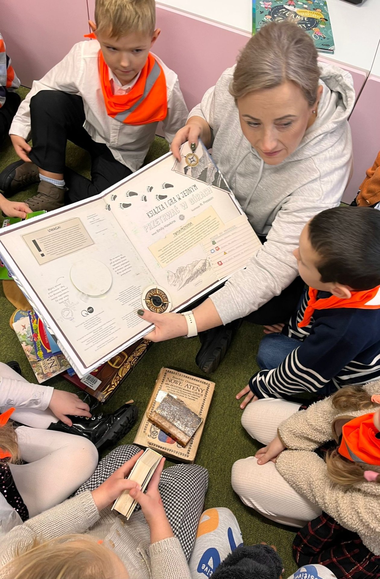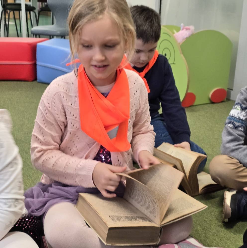 Ogromne wrażenie wywarła również wizyta w Czytelni Głównej. Dzieci z zaciekawieniem oglądały katalog kartkowy, powiększalnik tekstu z syntezatorem mowy, a także nowoczesny książkomat. Podczas zajęć rozmawialiśmy także o roli książki — o tym, że jest nie tylko źródłem wiedzy, ale również sposobem na rozwijanie wyobraźni, empatii i ciekawości świata. Książki uczą, bawią, pomagają zrozumieć innych i przenoszą nas w miejsca, do których nie zawsze możemy dotrzeć w rzeczywistości.