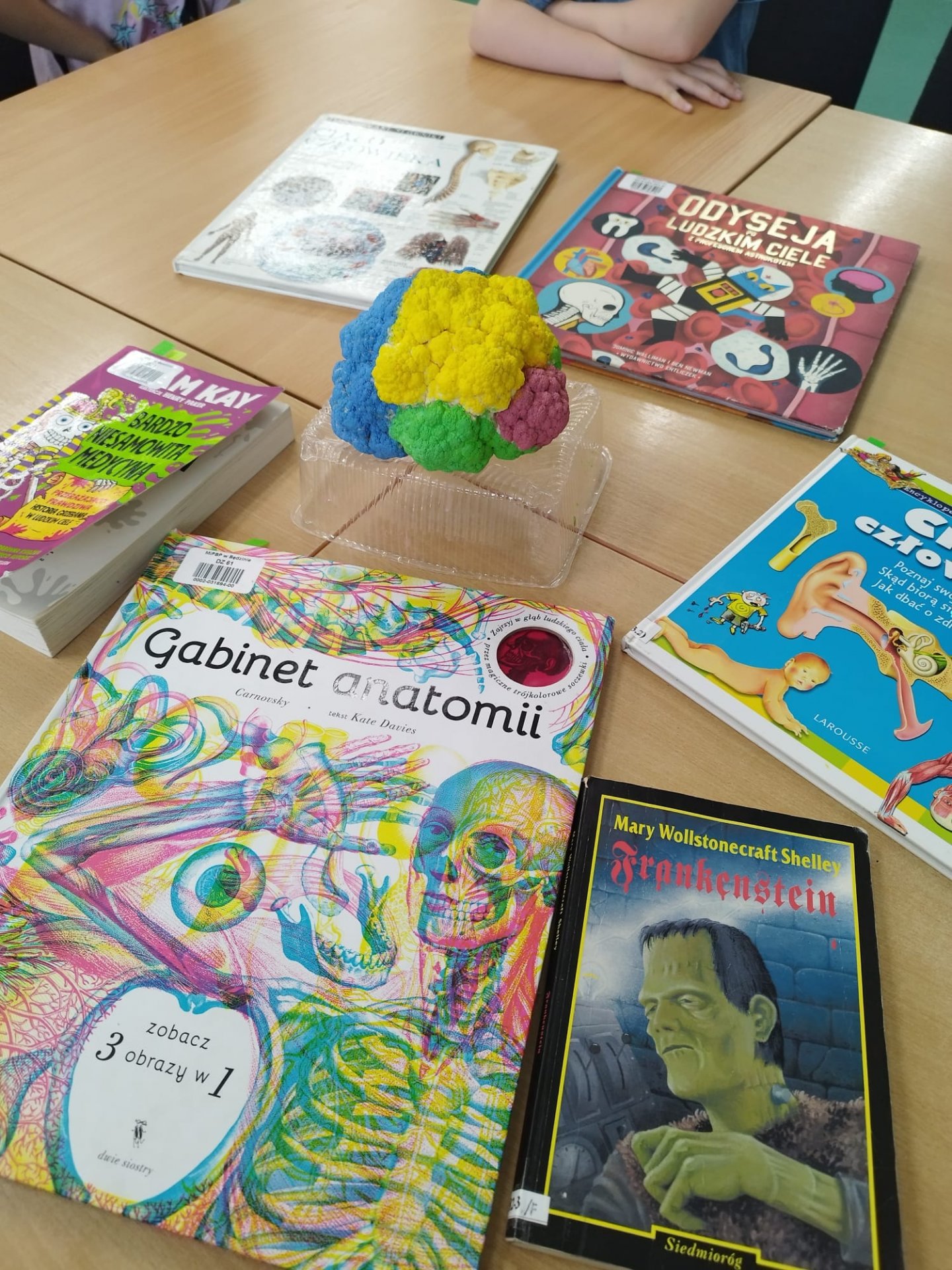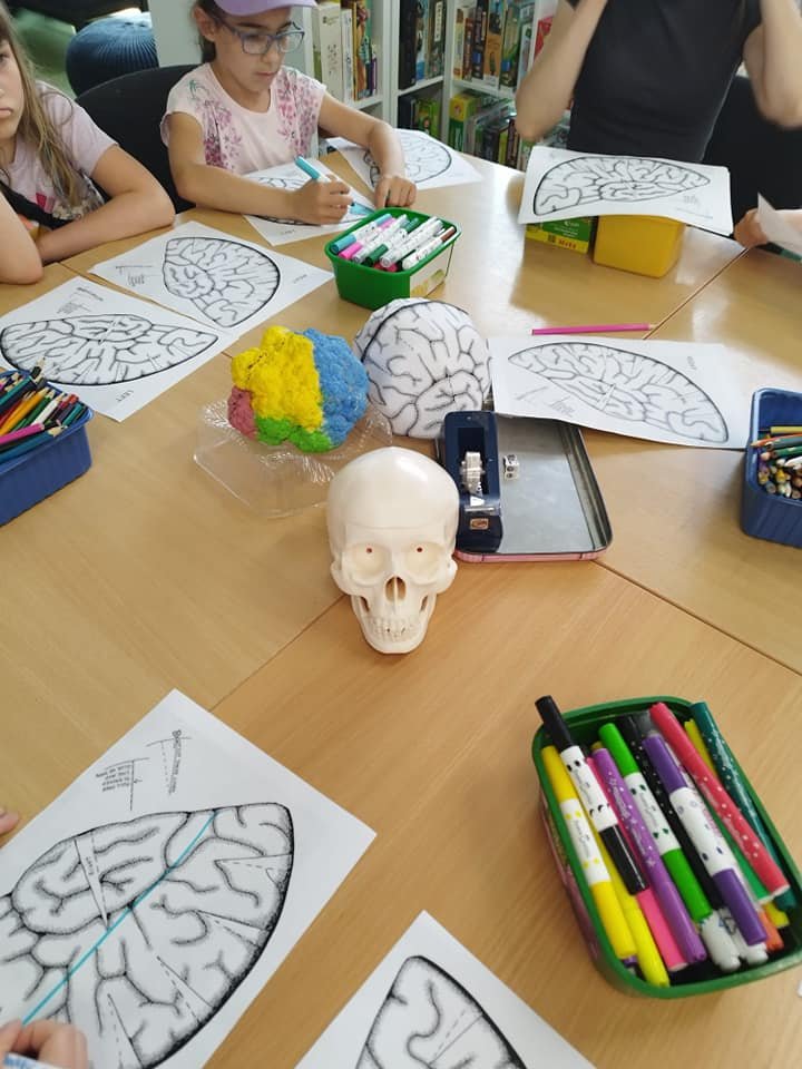 W trakcie czerwcowego spotkania za pomoce naukowe służyły dzieciom edukacyjne ilustracje, plastikowy odlew czaszki oraz kalafior!, który stanowi bardzo dobry model mózgu. W części praktycznej, każdy uczestnik stworzył mózgową czapkę, którą mógł założyć na głowę, by przekonać się bez użycia tomografu, gdzie znajdują się poszczególne ośrodki.