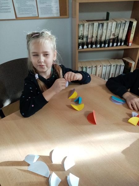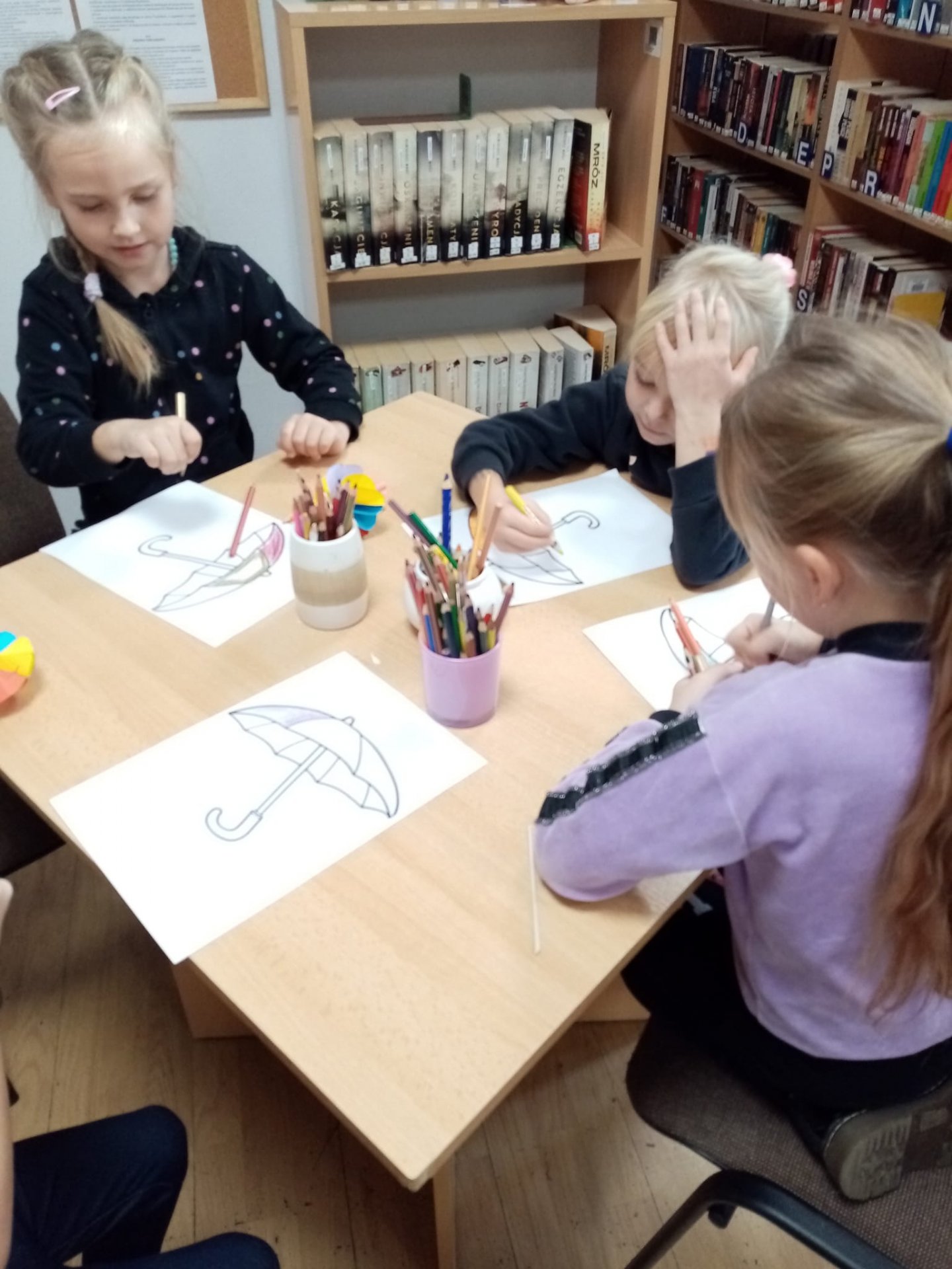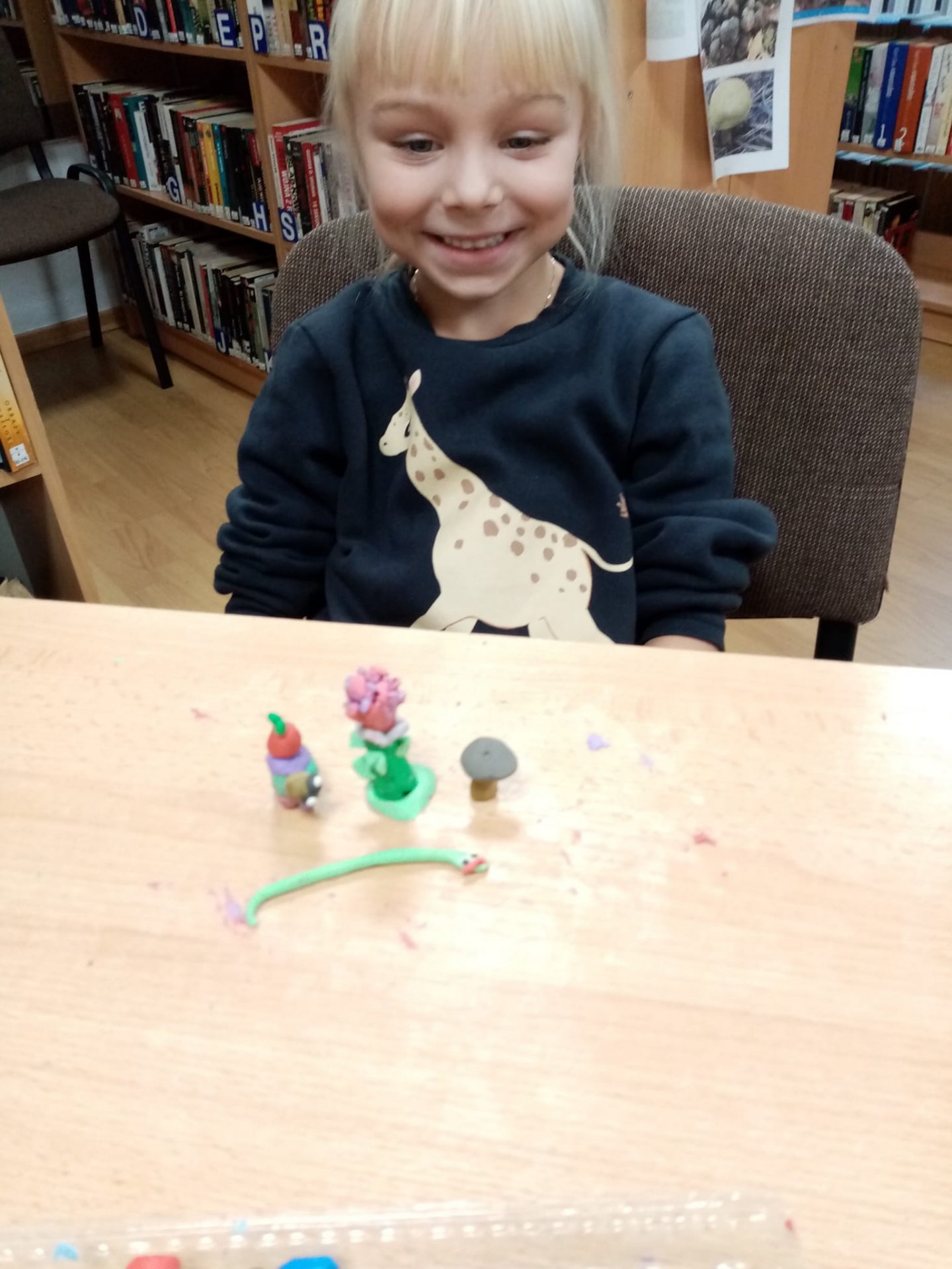 Za oknami jesień w pełni, więc odwiedzające w październiku Filię nr 2 Warpie dzieci, z wcześniej zebranych kasztanów i żołędzi, wykonują zabawne ludziki i zwierzątka. Wiewiórki robią zapasy na zimę, a niedźwiedzie szykują gawrę, bo niedługo zapadną w zimowy sen. A niedźwiadki powstałe w bibliotece można zabrać do domu. W ogrodach można jeszcze spotkać jesienne kwiaty i jeże, które szukają miejsca do snu. Dzieci wpadły więc na pomysł ulepienia z plasteliny jeża, ale ostatecznie lepiej wyszly im kwiatki.