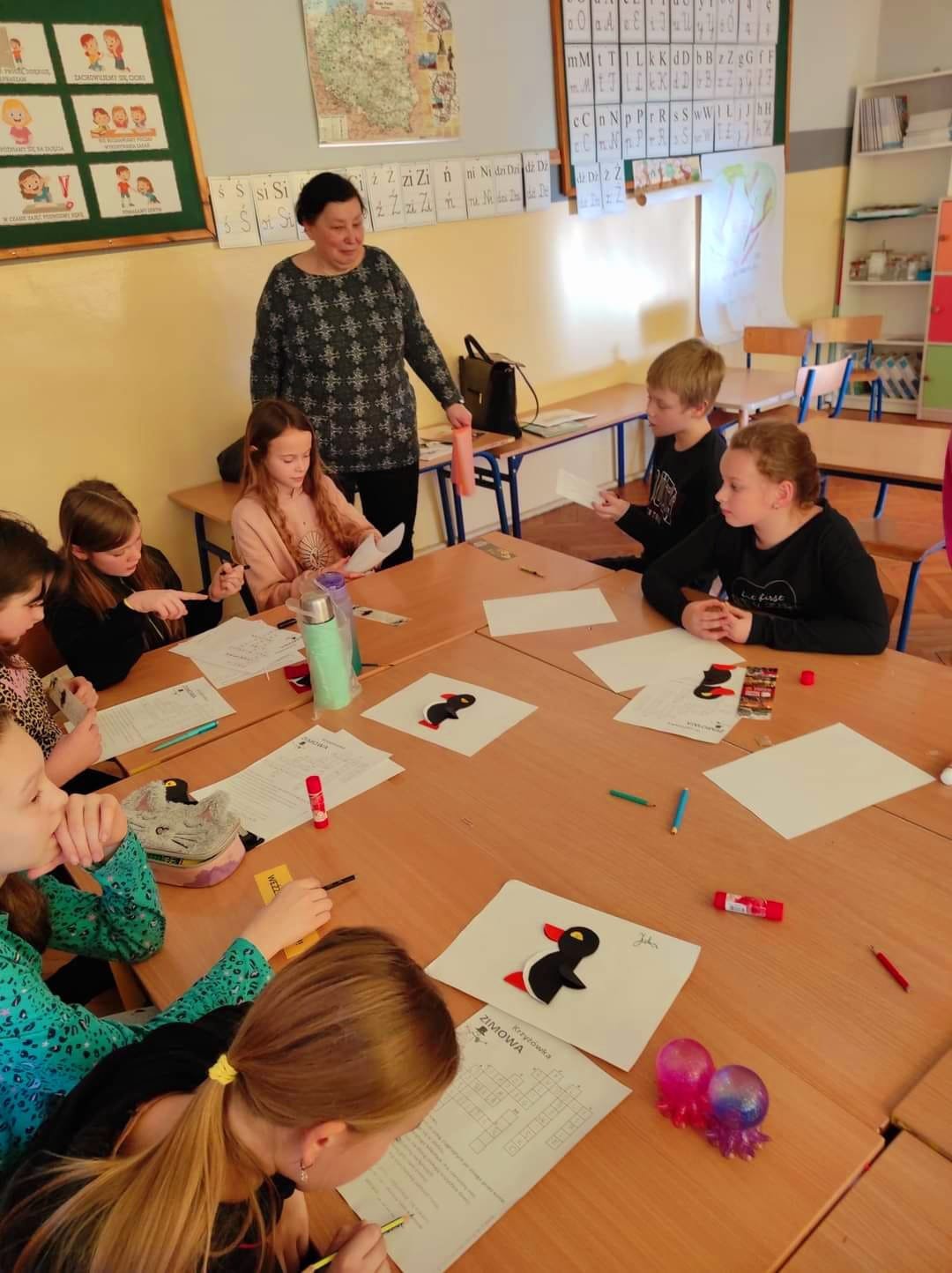 Zima, zima pada śnieg. Przygoda z wesołymi pingwinami. Pod takim hasłem uczniowie klas 1- 4 Szkoła Podstawowa nr 8 im. Jana Pawła II w Będzinie spędzili 3 godziny na kreatywnych zajęciach podczas, których: