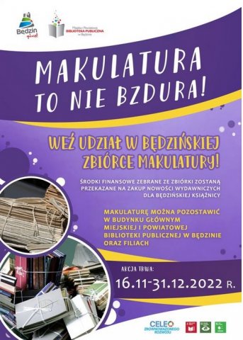 Niejako zbliżając się do końca roku Miejska i Powiatowa Biblioteka Publiczna w Będzinie ruszyła z miejską akcją „Makulatura to nie bzdura!”, gdzie po raz drugi zachęcamy mieszkańców miasta do zbierania makulatury, z której zakupimy nowe pozycje literackie.