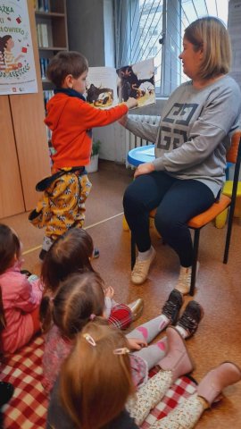 Dzieci podczas spotkania wysłuchały bajki pt. "Szym Pansik ma zły humor". To opowiadanie, którego główny bohater, ma zły dzień, zupełnie bez powodu.