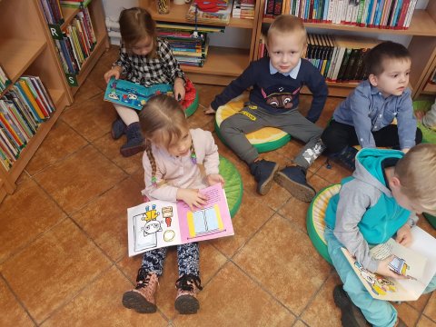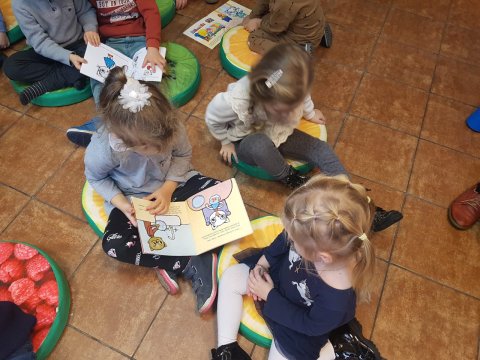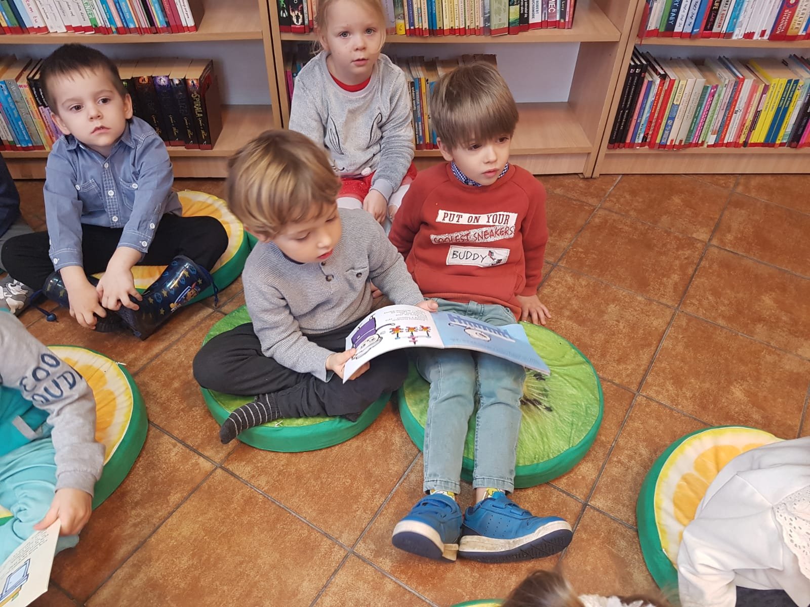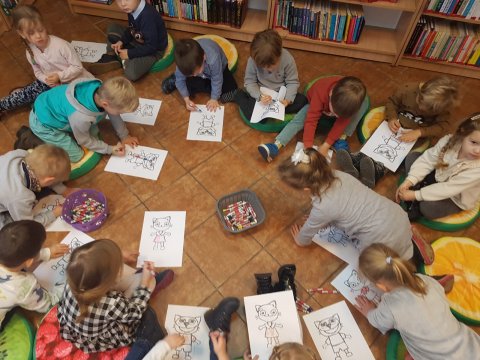 Przedszkolaki dobrze znały główną bohaterkę, ale chętnie wysłuchały opowiadania pt: „Kicia Kocia w bibliotece”. Dowiedziały się, że oprócz wypożyczana książek w bibliotece można również obejrzeć bajkę na dużym ekranie, zagrać w przedstawieniu teatralnym, namalować ilustrację do książki, a nawet spotkać autorkę książek dla dzieci. W bardzo aktywny sposób zaangażowały się do rozmowy na temat poznanej przygody.