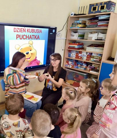 My świętowanie nieco przedłużamy i zapraszamy z naszymi bibliotekarkami, które ostatnio wędrowały po przedszkolach, do świata zapachu miodu, szelestu kartek ulubionych książek i tajemnic Stumilowego Lasu.