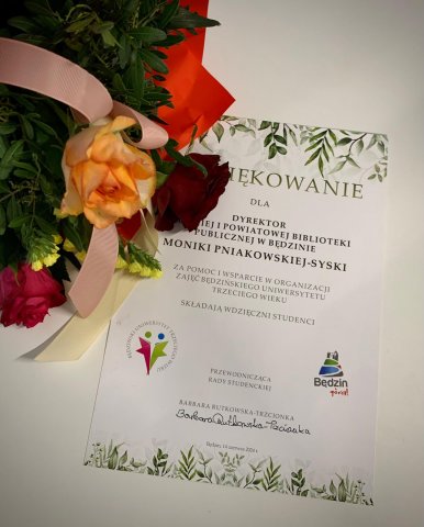 Podczas uroczystego zakończenia roku akademickiego 2023/2024 Będzińskiego Uniwersytetu Trzeciego Wieku w Teatr Dormana Miejska i Powiatowa Biblioteka Publiczna w Będzinie otrzymała podziękowania od organizatorów oraz studentów BUTW.