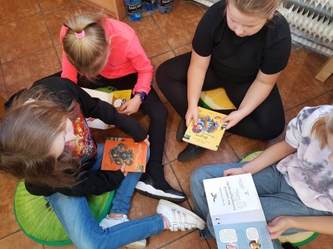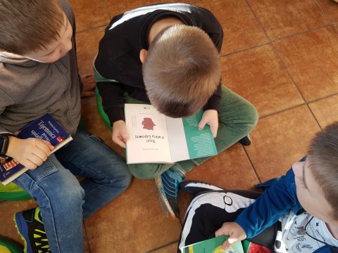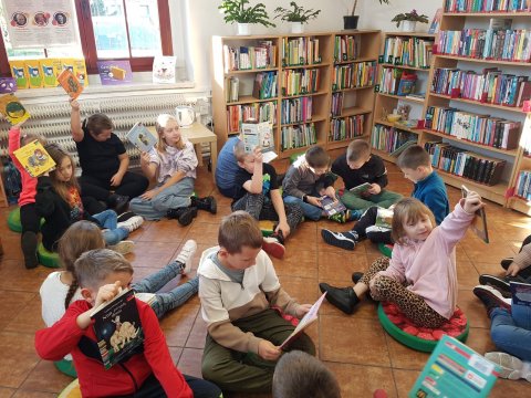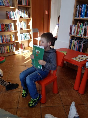 Podczas wizyty dzieci opowiedziały o swoich zainteresowaniach czytelniczych i ulubionych książkach oraz ich bohaterach. Spotkanie w bibliotece nie mogło się odbyć bez głośnego czytania. Tym razem to nie bibliotekarka czytała lecz same dzieci. Największym zainteresowaniem cieszyły się książki z serii „Czytam sobie”. Na zakończenie dzieci rozwiązywały krzyżówkę, a do szkoły zabrały zakładkę, którą ozdobią według własnego uznania.