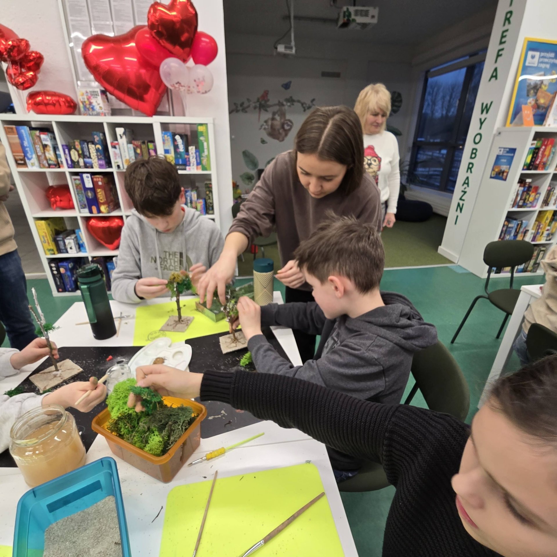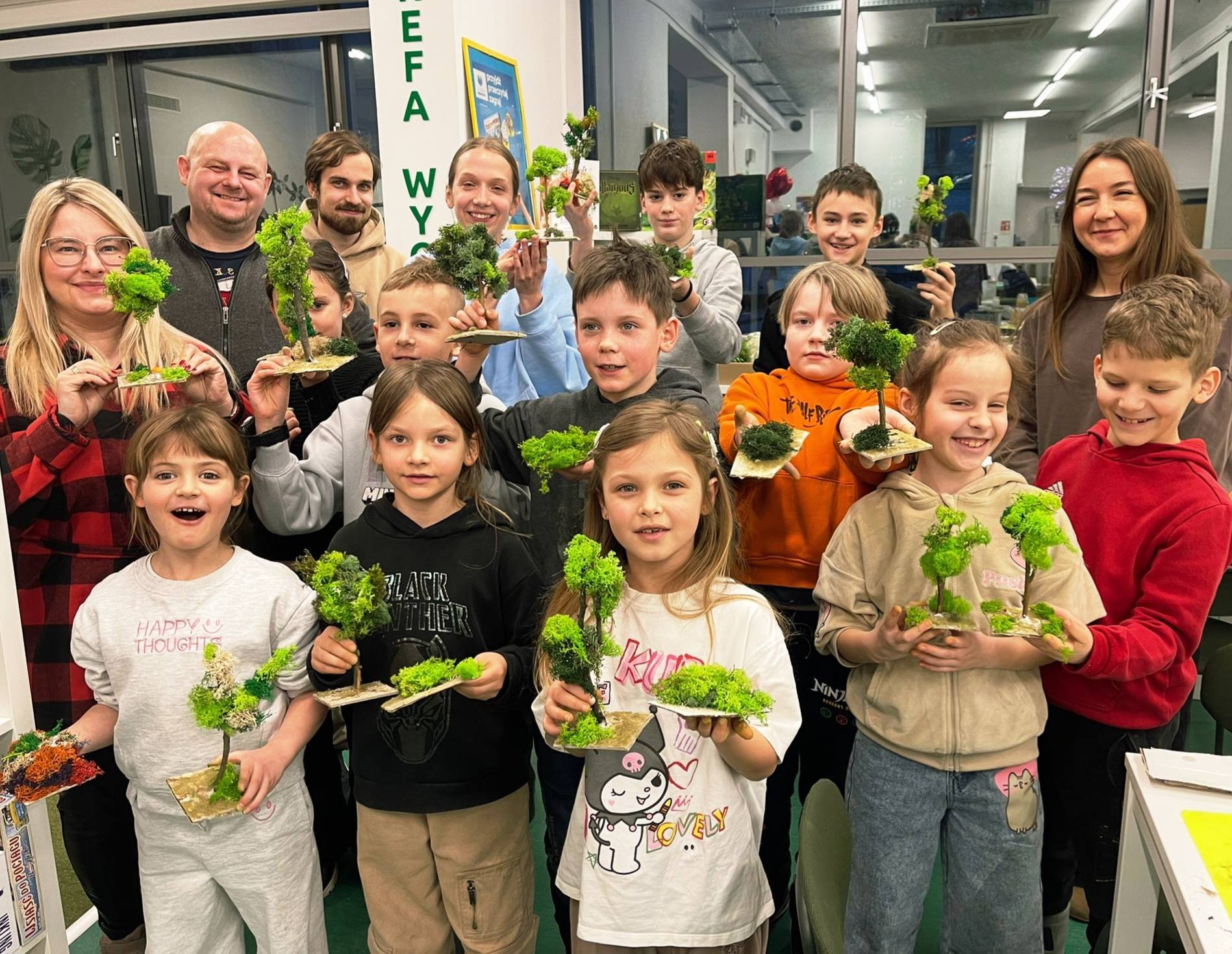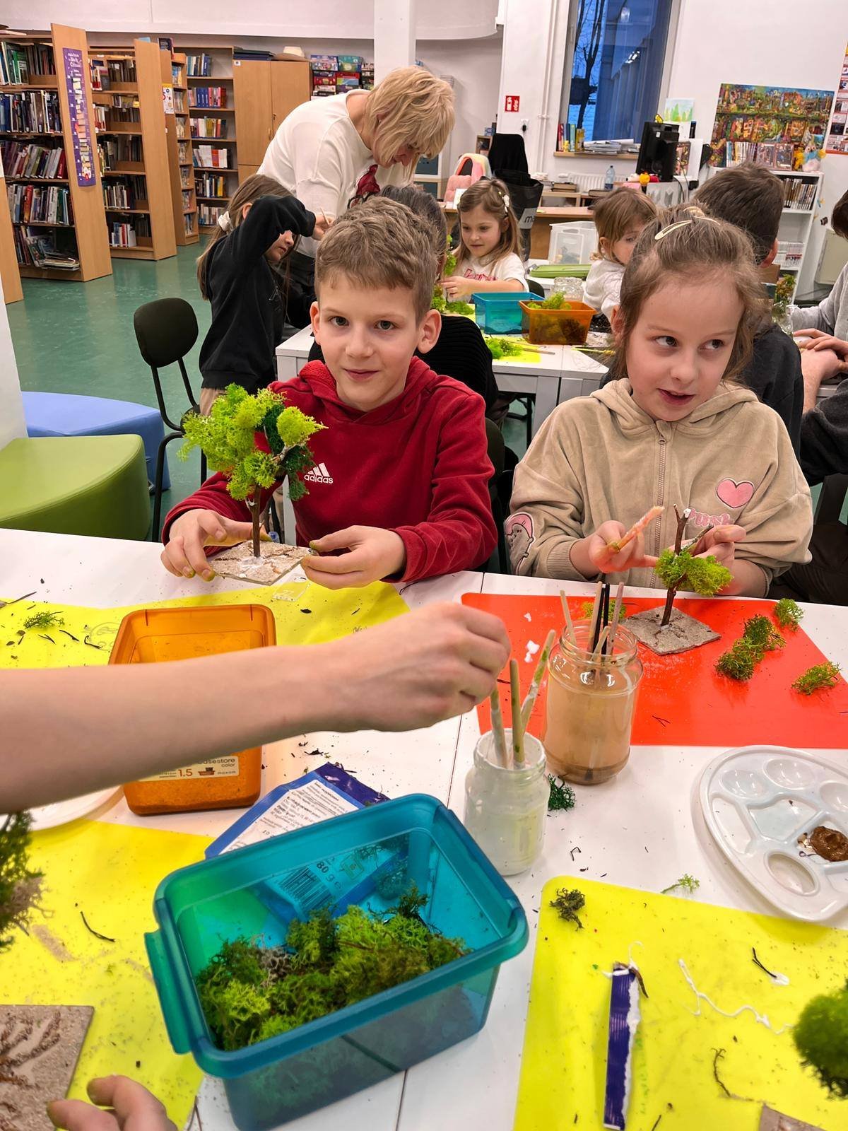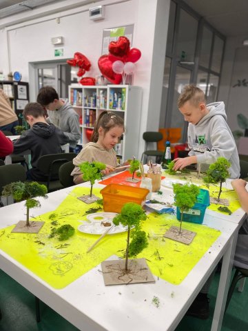 Uczestnicy z wielkim zaangażowaniem konstruowali miniaturowe drzewa i krzewy. Budowa wymagała ogromnego skupienia, cierpliwości i niemałej precyzji, ale młodzi twórcy poradzili sobie z tym wyzwaniem śpiewająco. Mimo ambitnego zadania, w sali nie brakowało zabawy i głośnego śmiechu, szczególnie podczas formowania puszystego chrobotka. Wspólna praca stała się też doskonałą okazją do integracji i wzajemnej pomocy przy trudniejszych elementach konstrukcji.