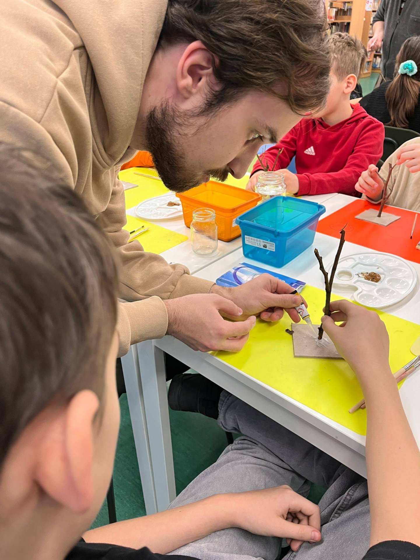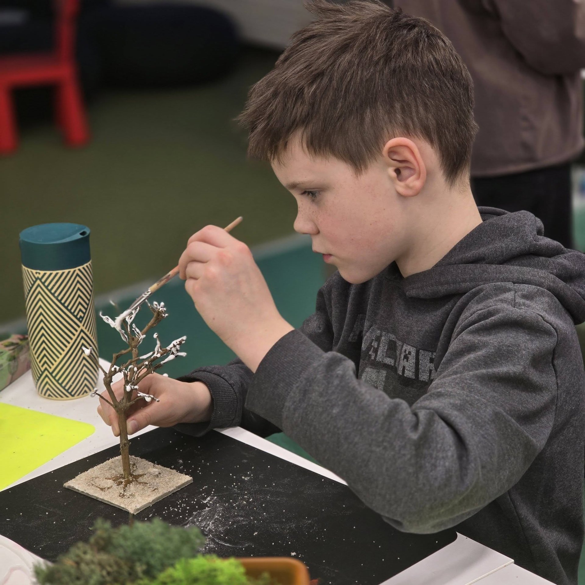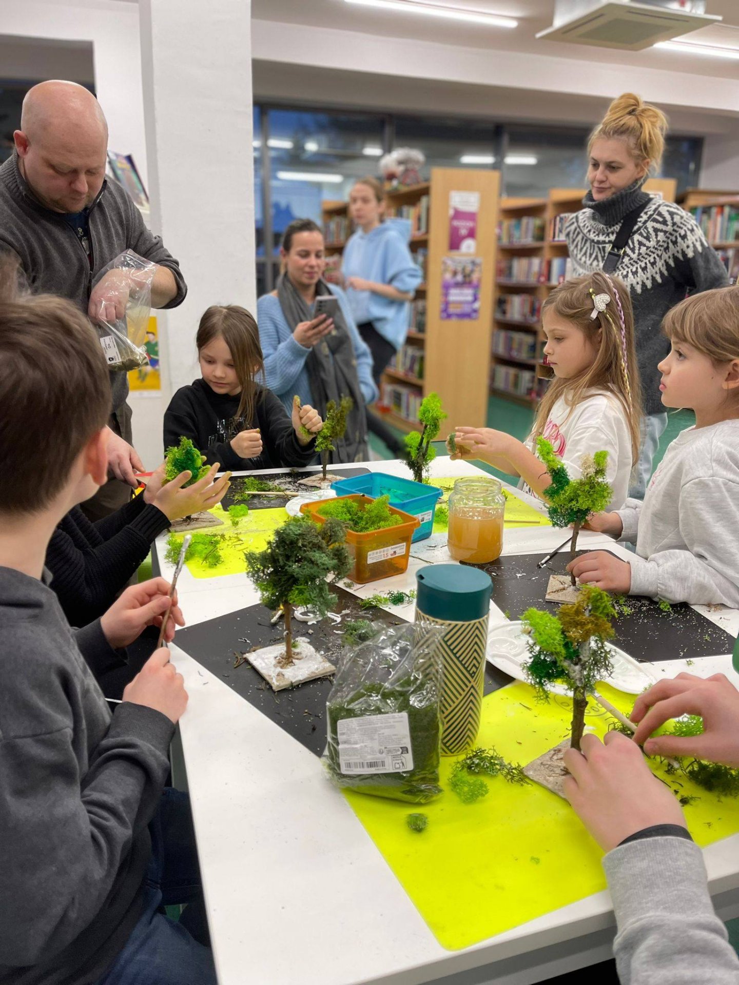 Uczestnicy z wielkim zaangażowaniem konstruowali miniaturowe drzewa i krzewy. Budowa wymagała ogromnego skupienia, cierpliwości i niemałej precyzji, ale młodzi twórcy poradzili sobie z tym wyzwaniem śpiewająco. Mimo ambitnego zadania, w sali nie brakowało zabawy i głośnego śmiechu, szczególnie podczas formowania puszystego chrobotka. Wspólna praca stała się też doskonałą okazją do integracji i wzajemnej pomocy przy trudniejszych elementach konstrukcji.