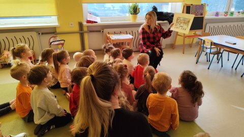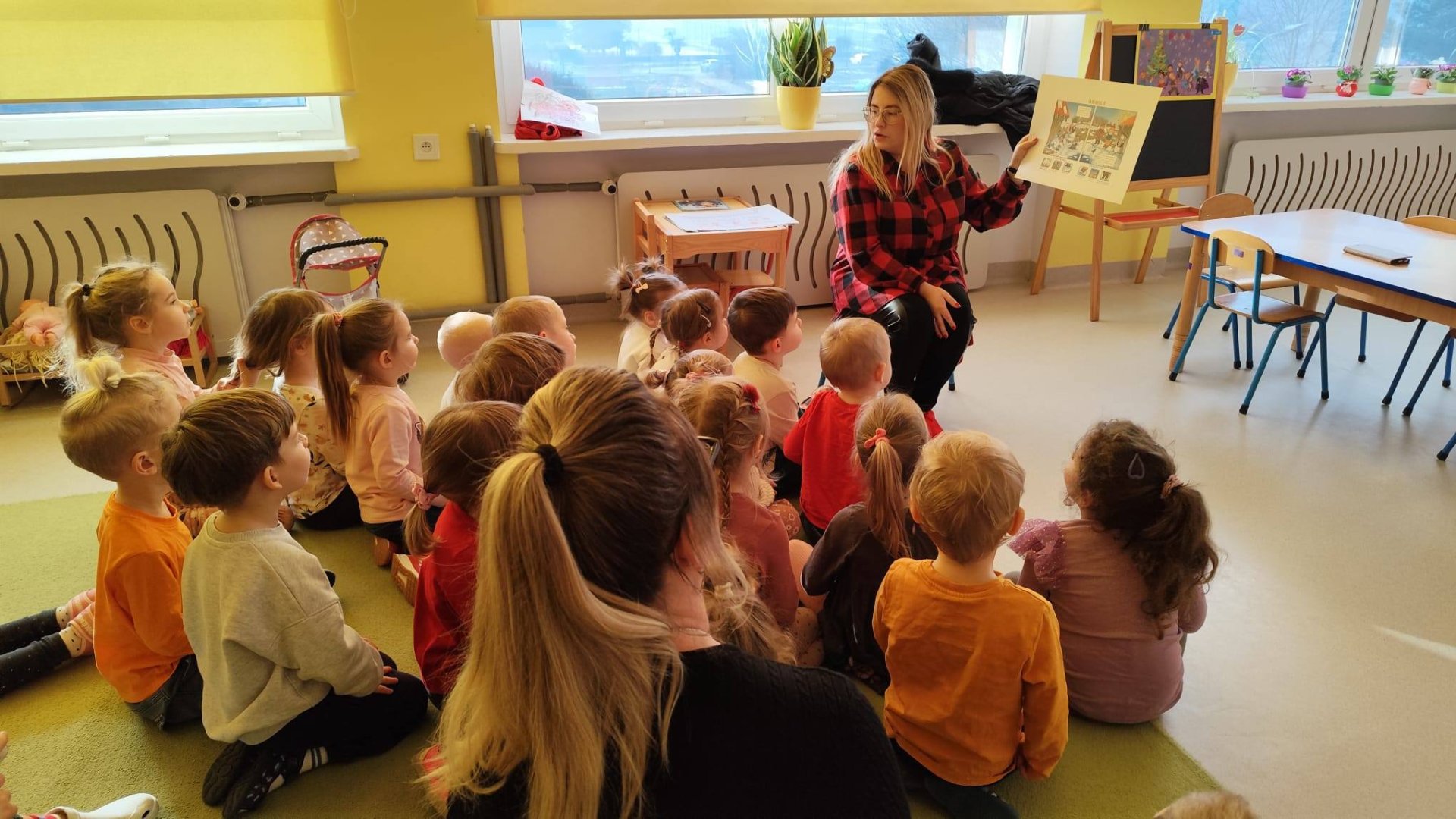 → wspólne czytanie przygód „Kici Koci” w zimowej scenerii - przedszkolaki z zapartym tchem śledziły losy ulubionej bohaterki
