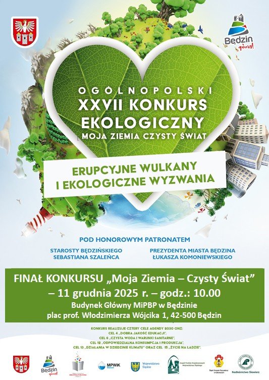 Ogólnopolski konkurs Moja Ziemia - Czysty Świat pt.: „Erupcyjne wulkany i ekologiczne wyzwania” jest organizowany przez Urząd Miejski w Będzinie, Starostwo Powiatowe w Będzinie, Miejską i Powiatową Bibliotekę Publiczną w Będzinie, Zespół Parków Krajobrazowych Województwa Śląskiego, Państwowe Gospodarstwo Leśne - Lasy Państwowe Nadleśnictwo Siewierz, Miejskie Przedsiębiorstwo Wodociągów i Kanalizacji w Będzinie oraz Śląski Związek Pszczelarzy w Katowicach - Koło Pszczelarzy Będzin. Konkurs skierowany jest do dzieci począwszy od przedszkola (grupa 6-latków, klas "0"), aż po uczniów szkół ponadpodstawowych! Każdy znajdzie coś dla siebie!
